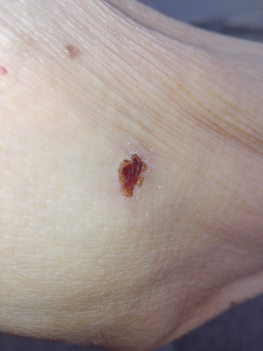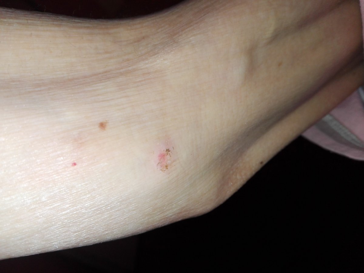 Ho notato questa crosta sul braccio di mia madre 80enne. Soffre di altzheimer, non parla correttamente e non è attendibile. La foto è di oggi, ieri la crosta era più grande e rotonda (diametro 1 cm). Potrebbe trattarsi di una scottatura o dovuta a qualche tipo di ferita o altro motivo ?