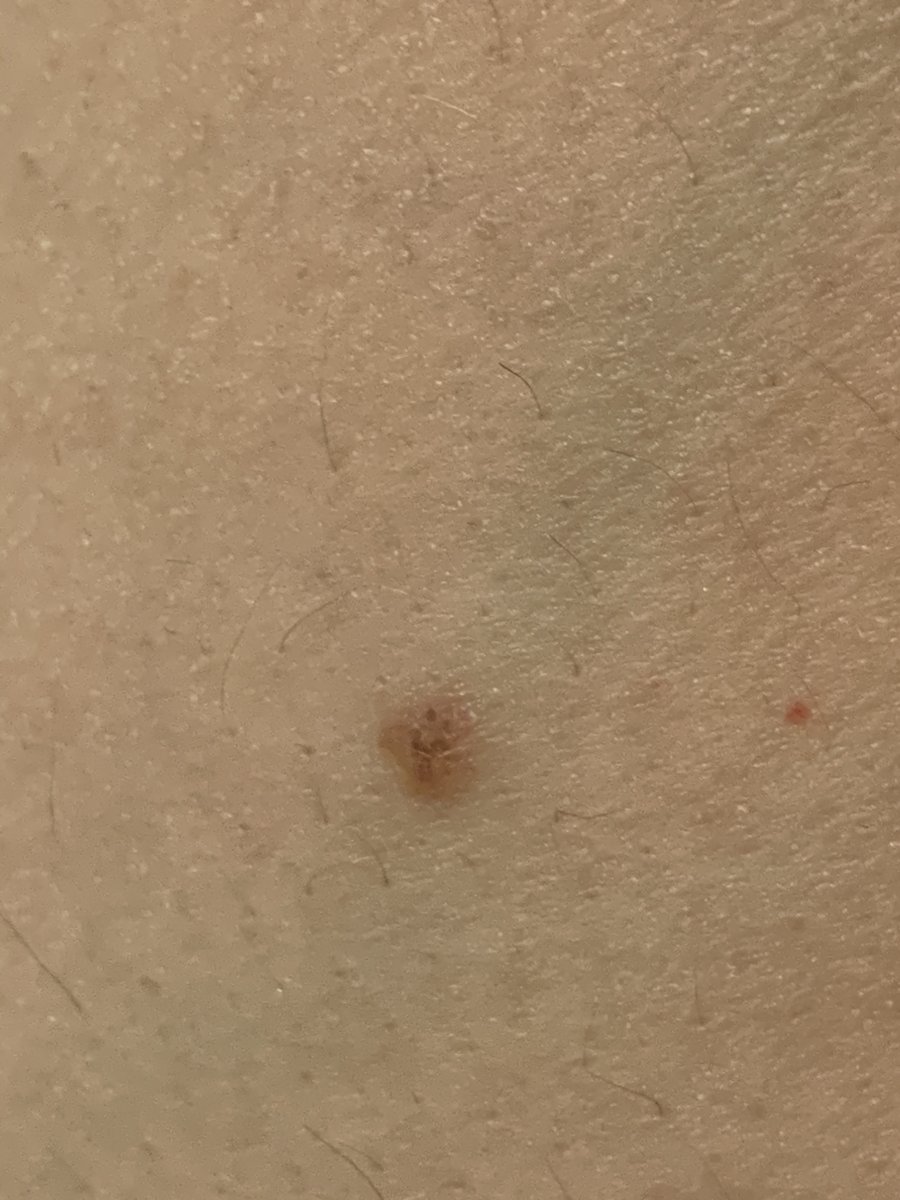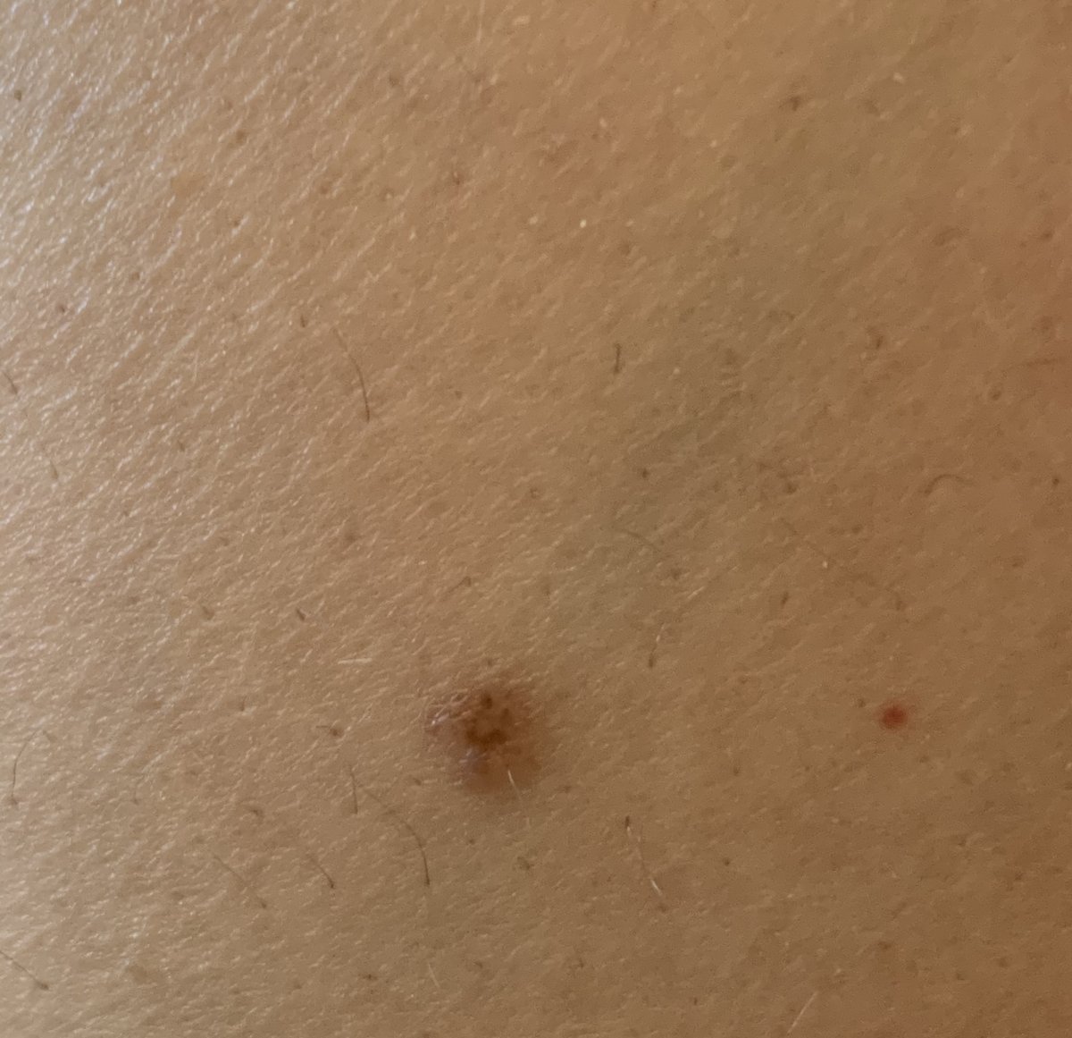 il neo di cui le ho chiesto nei mesi scorsi si è poi stabilizzato così. La parte più scura è in corrispondenza di dove si era inizialmente formata la crosticina.