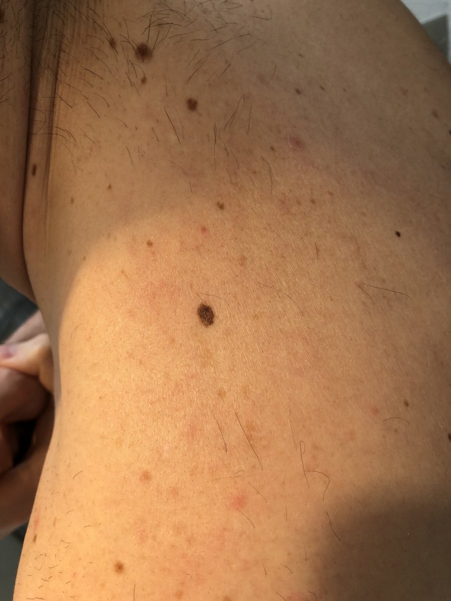 La situazione è questa. C’è una leggerissima differenza di colore dove c’era la macchia pigmentata rispetto alla pelle circostante, sembra quasi che la pelle si stia esfoliando.