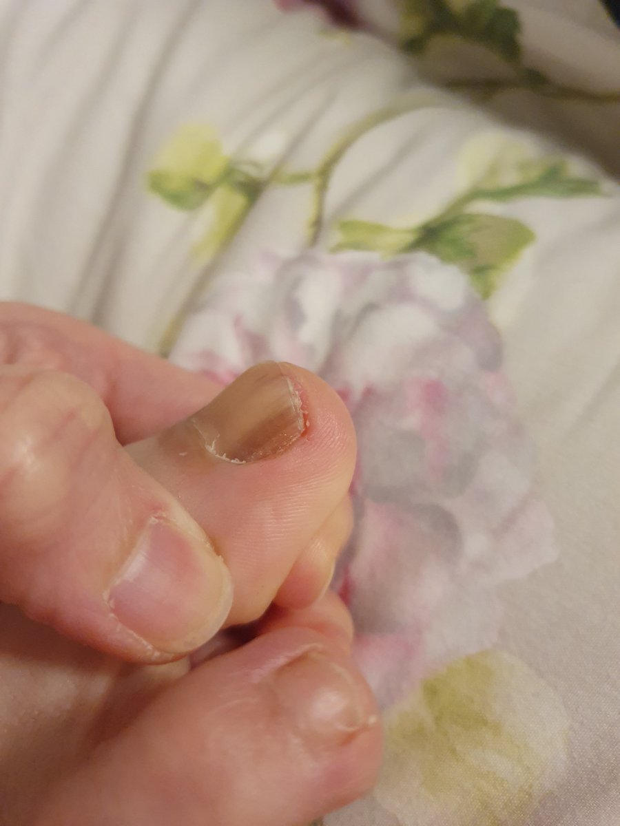 LE ALLEGO LA FOTO DELL’UNGHIA DELL’ALLUCE IN QUANTO DA CIRCA UN ANNO SI E’ FORMATA UNA BANDA DI COLOR MARRONE GRIGIO IN TUTTA LA LUNGHEZZA ED E’ ANCHE ABBASTANZA LARGA.