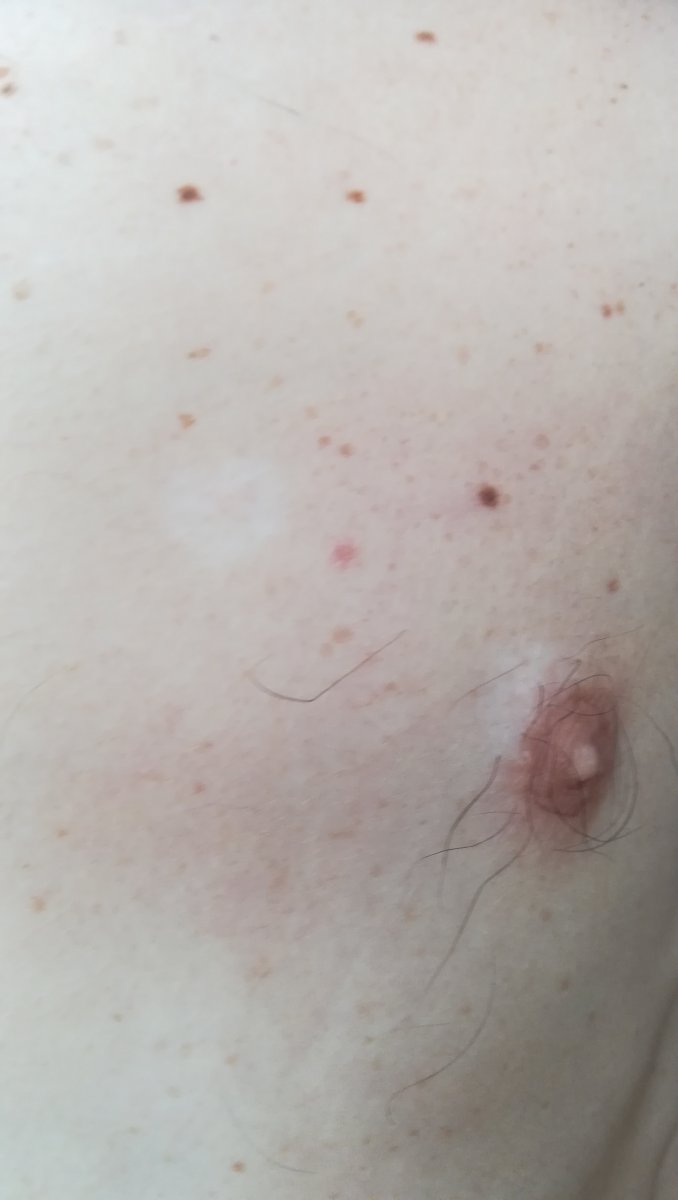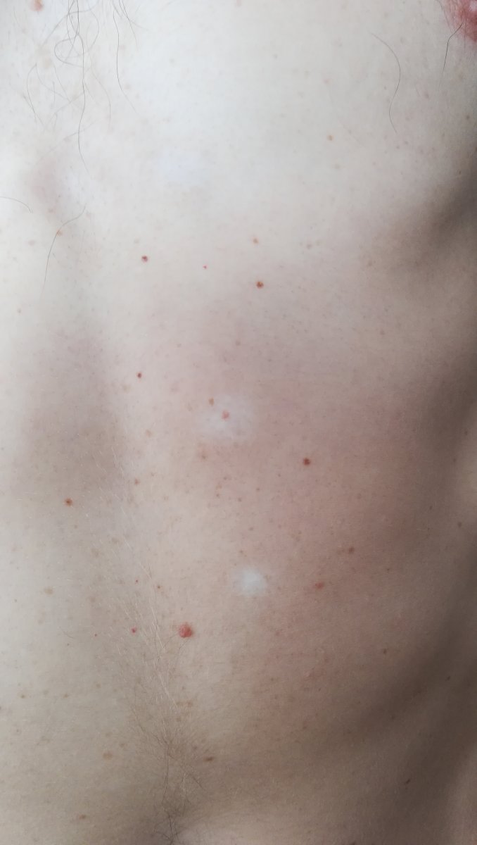 Due macchie zona addome , una petto e una vicina al capezzolo poi ce ne sono altre dietro la schiena.