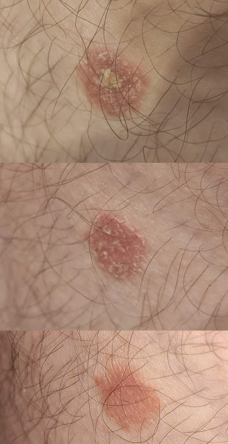 (Dall alto verso il basso, la macchia ad 2 settimane dalla comparsa, 3 settimane e 4 settimane, attualmente a 6 settimane e’ identi alla 3 foto.)