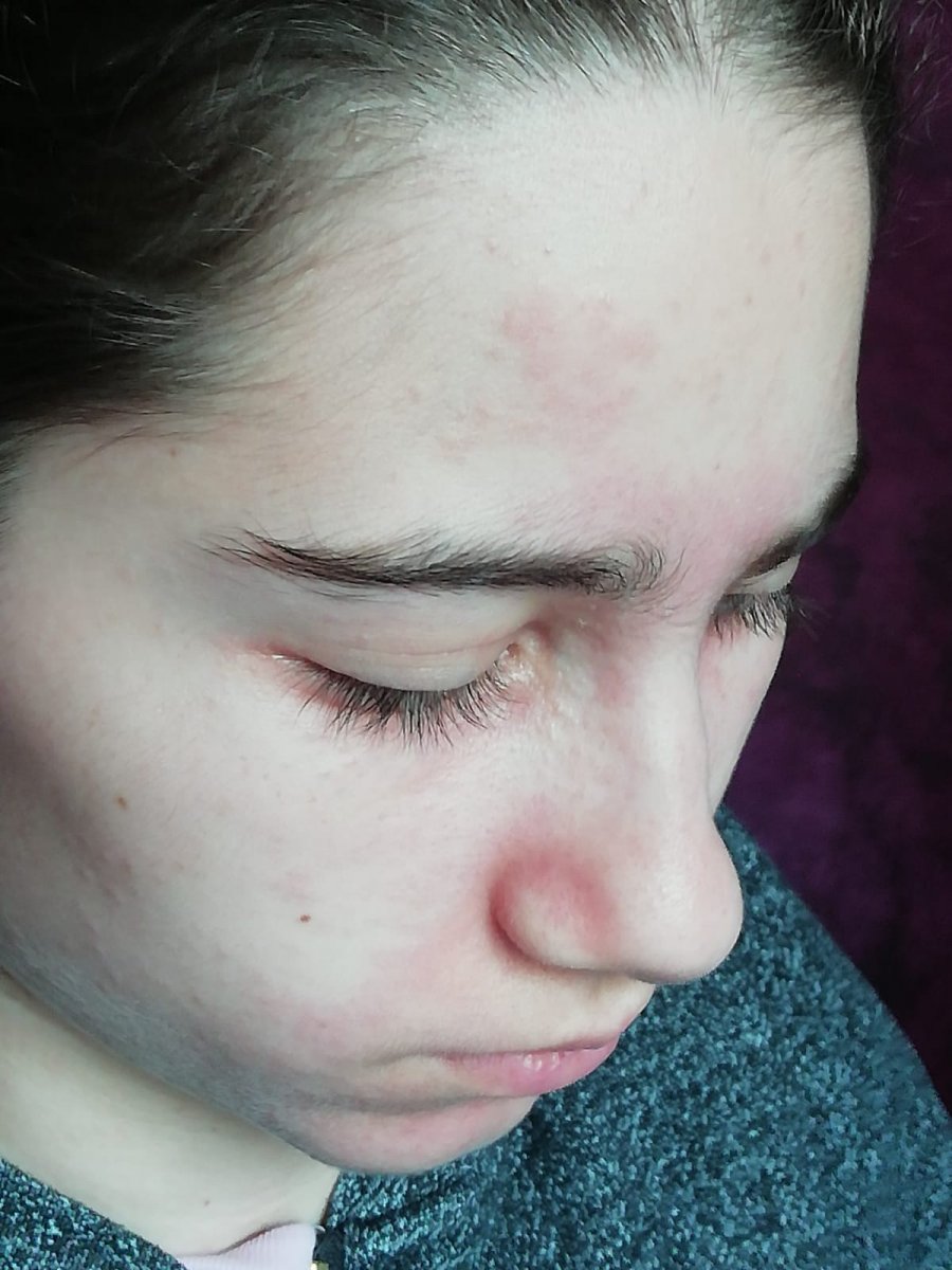 Il 14/05 il dermatologo ha diagnosticato un eczema al volto su aree seborroiche. Da piccola aveva sofferto di una forma di dermatite localizzata sui gomiti da cui poi era guarita.