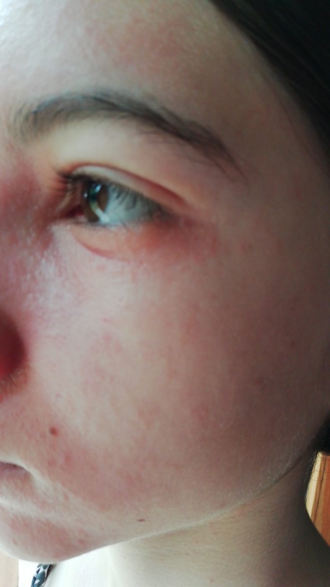 E’ stato prescritto inizialmente un antistamicico, Kestine. Poi una crema, Locoidon da usare per 10 giorni sulle aree arrossate. Dal 28 Maggio scorso visto che la situazione non migliorava è stato aggiunto Deltacorten 25mg, prima mezza compressa per 7 giorni e poi un quarto di compressa per altri 7 giorni. Per tutto il periodo è stata usata anche Tolerance Exreme Creme (Avene) più volte al giorno e Sensiquell Creme lavante (Canova) come detersione quotidiana. Il problema sembrava quasi rientrato (foto1) ma al termine della cura con Deltacorten si è ripresentato, in concomitanza con gli esami di 3° media inferiore (stress?) e via via peggiorato. L’uso successivo di Linimento Olio Calcareo non ha portato giovamento ma anzi ha determinato la comparsa di squame.