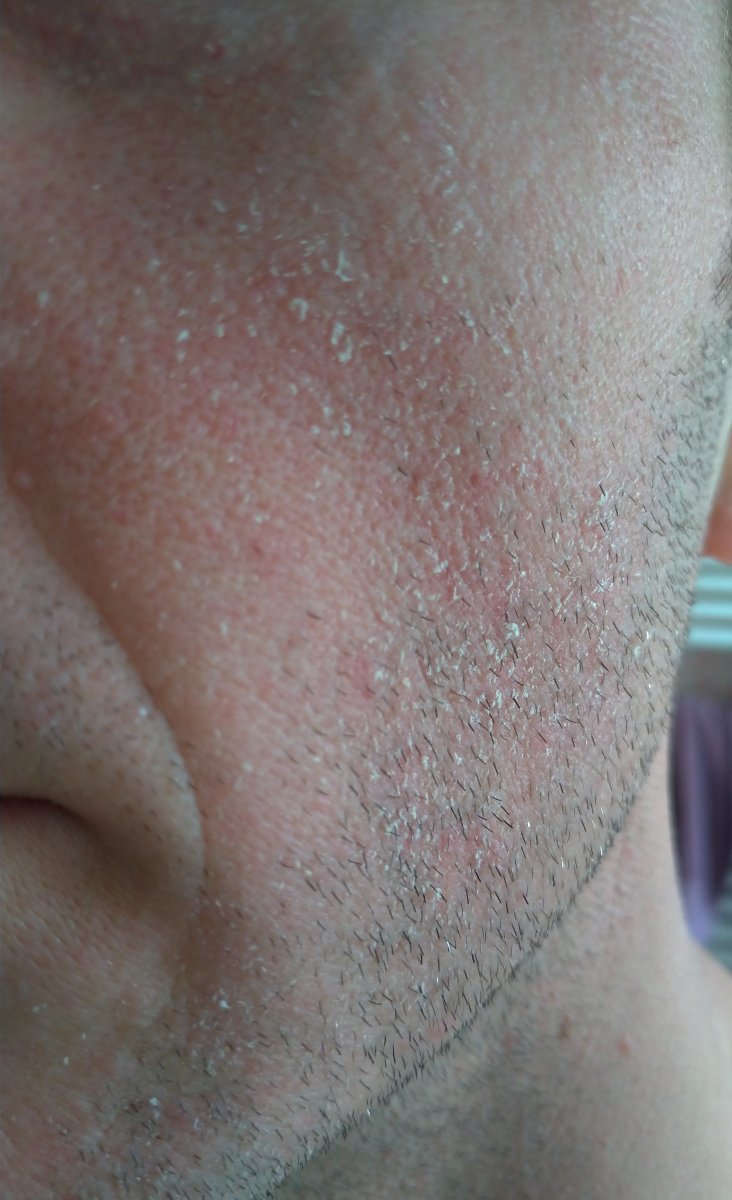 purtroppo dopo un paio di giorni di regressione, inspiegabilmente la situazione è precipitata, forse peggio di prima. Da lunedì è apparsa questa forte irritazione che non accenna a diminuire, anche la zona del mento che non è mai stata particolarmente coinvolta dal fenomeno.