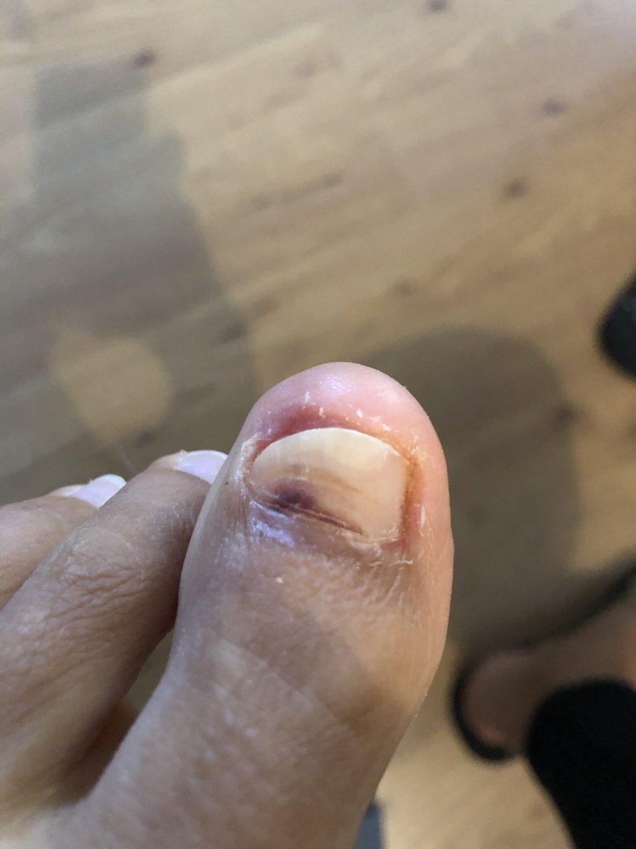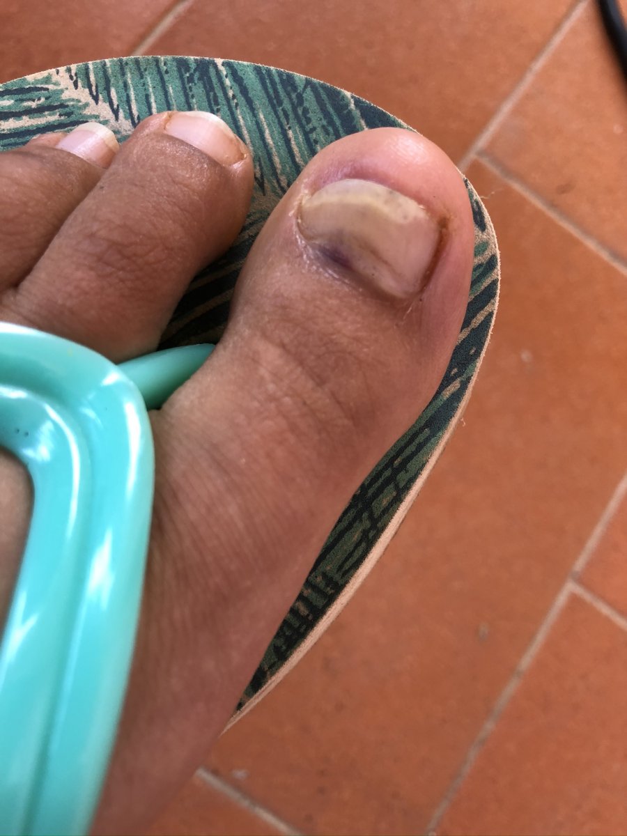 sto curando – seguita da una dermatologa – da un paio d’anni quest’unghia per la macchia bianco-gialla in alto a sinistra che ormai ha preso quasi tutta la superficie, diagnosticatami come onicomicosi. Sotto l’unghia è come “sollevata”, la pelle sotto come ispessita. Dopo i primi mesi di cura (Oliprox) era migliorata, poi si era come stabilizzata. Cambiando cura (Vea Onicovitt) era molto migliorata e quasi del tutto scomparsa. Poi è peggiorata di nuovo. Sempre su consiglio della dermatologa sono tornata a Oliprox, ma nulla sempre peggio. Ora, dal controllo dell’ultima volta che è stato a fine giugno, sto usando Miconal senza grandi progressi. A fine giugno, mentre ero al mare, è però comparsa anche questa macchia scuro-violacea alla base. Non ricordo particolari traumi, ma ho fatto molto trekking anche su sentieri ripidi e rocciosi. Ricordo lieve dolore alla base nei giorni in cui mi sono accorta della macchia, più spostato verso la parte alta del dito che dell’unghia però. E anche leggero prurito, come se la pelle fosse irritata. La dermatologa l’ha vista all’ultimo controllo, e mi ha detto che è da trauma. Inizio però a non avere più fiducia vista anche la micosi che sembra non passare mai, quindi volevo chiedere un secondo parere anche e sopratutto riguardo la macchia scura. Allego foto: quella con la ciabatta azzurra è come appariva un mese fa, l’altra com’è oggi. Mi sembra leggermente più estesa, come se si fosse spostata verso la parte alta. Grazie mille anticipatamente!