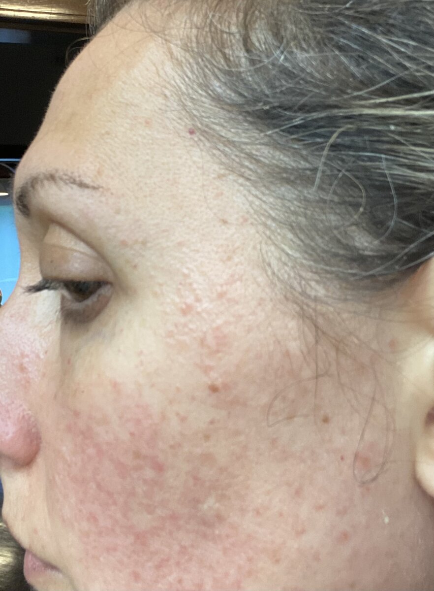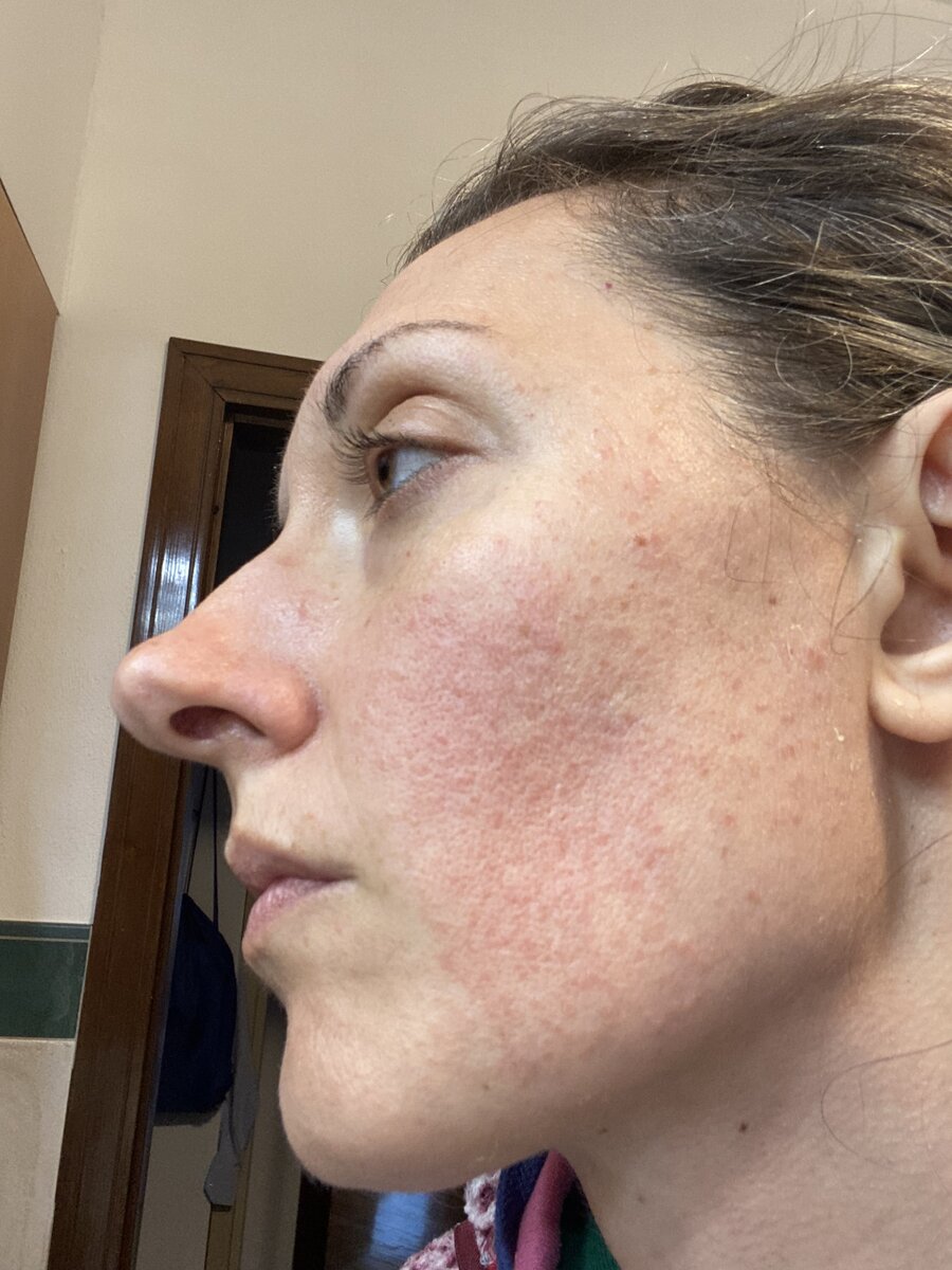 da gennaio di quest’anno sono comparse inizialmente sulla guancia verso la mandibola dei piccoli rilievi arrossati sottocutanei (come piccole eruzioni disposte linearmente) che col tempo anziché scomparire si sono estesi a tutta la guancia e ora anche alle tempie di entrambi i lati del viso. Soffro di asma ai peli del cane (che sono presenti a casa di mia mamma che vado a trovare nel week-end) ed il dermatologo mi ha prescritto delle creme antirossore per rosacea (sensi io AR crema e un detergente delicato dell’avene) e indicato di sentire l’allergologo per aumentare gli antistaminici in quanto a suo avviso è quasi certo che la reazione sia dovuta ai cani. Nei mesi il rossore anziché attenuarsi è aumentato e questo a prescindere dall’esposizione ai cani (inoltre anche negli anni precedenti mia mamma aveva i cani ma non ho mai avuto reazioni croniche a livello di pelle, al massimo piccoli arrossamenti pruriginosi temporanei.. della durata di 10-15 minuti in caso di contatto diretto), per cui mi sta venendo il dubbio che possa non essere legato a questo. Sicuramente anche la nuova routine di pulizia e crema non sta funzionando. Preciso che su fronte e mento e sul corpo non ho nulla.