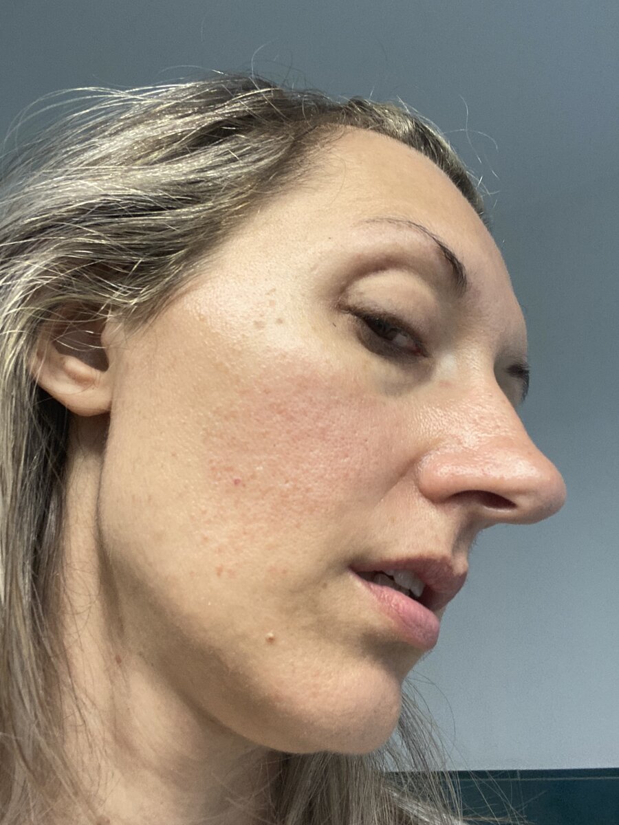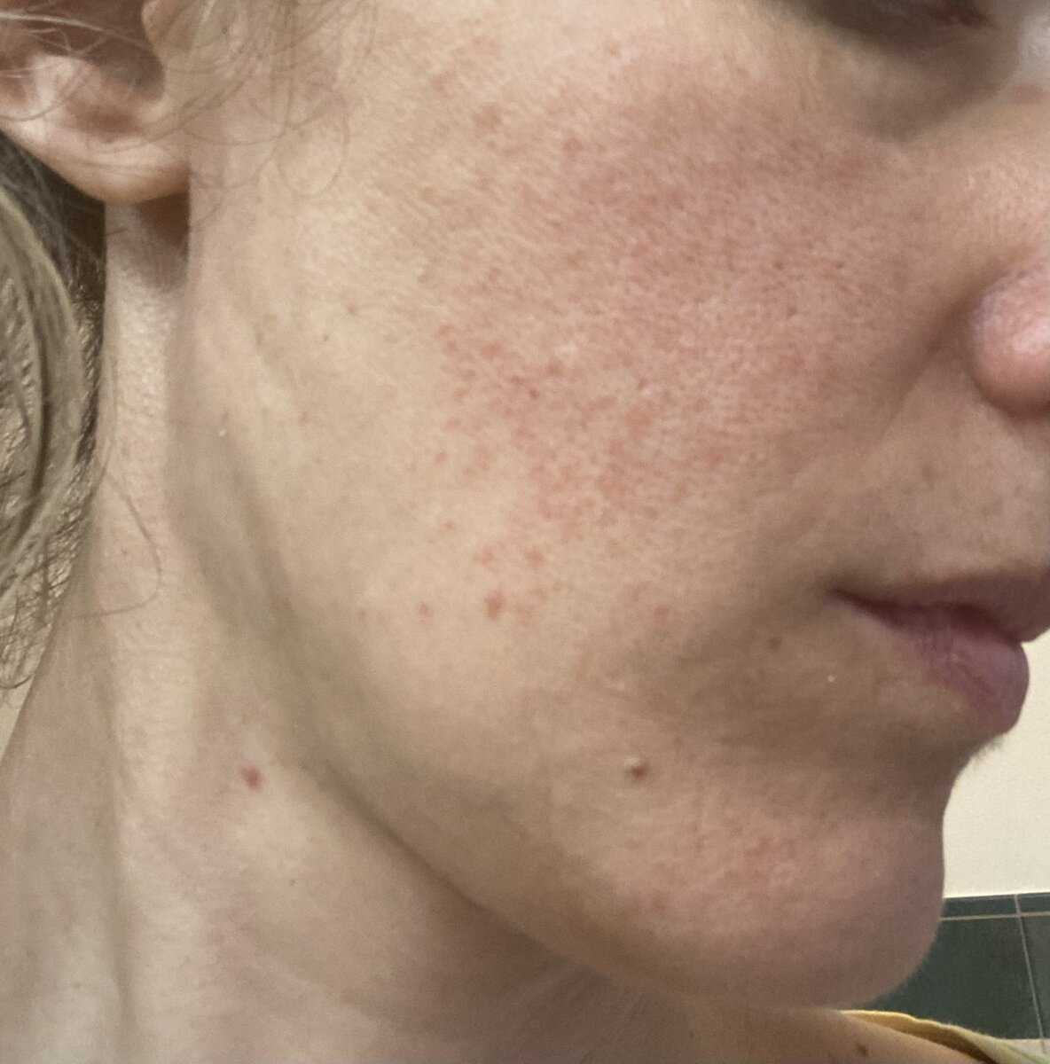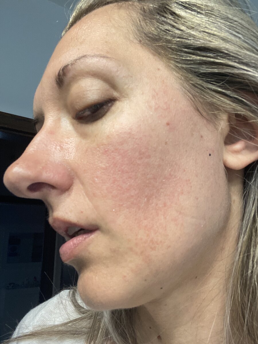 SaraSZMembroSalve ho effettuato 3 settimane di pieno digiuno cosmetico: nessun prodotto e lavaggio con acqua tiepida al mattino. La pelle è ora un po’ sfiammata ma la rosacea/ dermatite è ancora molto estesa ed evidente e si sta estendendo verso mento e tempie. Fiduciosa di un suo consiglio, la ringrazio in anticipo. Allego sotto sia foto guancia destra che sinistra. Su fronte e resto del corpo non ho nulla.