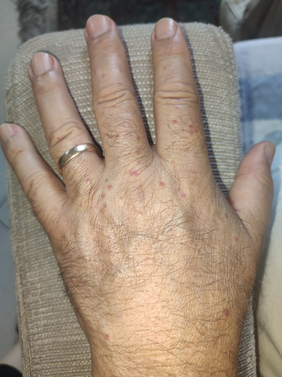 Mio padre da ieri ha queste bollicine rosse sulla mano sinistra e qualcuna sulla mano destra. Non ha alcun prurito e ci chiedevamo cosa potesse essere. Lui sostiene che sia una reazione allergica a qualcosa, cosa ne pensa?