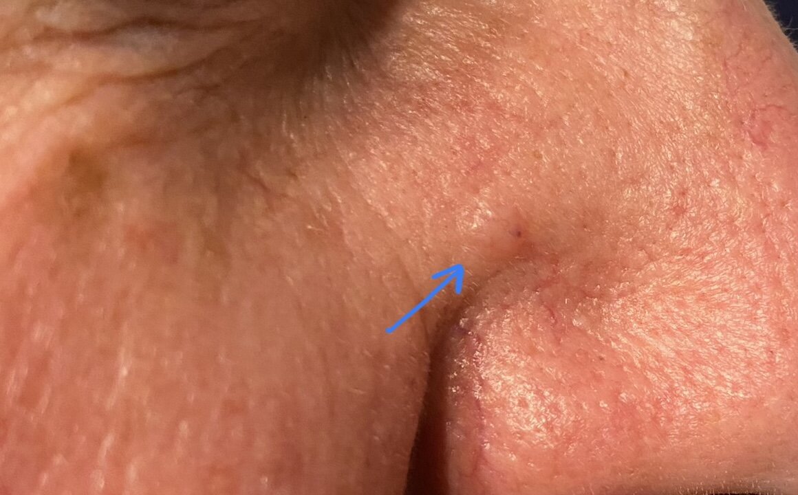 suo naso di mio padre, 67 anni, è da qualche mese comparsa questa neoformazione in rilievo color rosa pelle/biancastro, lucida. Adesso, al centro, è comparso un puntino scuro. Potrebbe essere un basalioma o un melanoma nodulare? Grazie