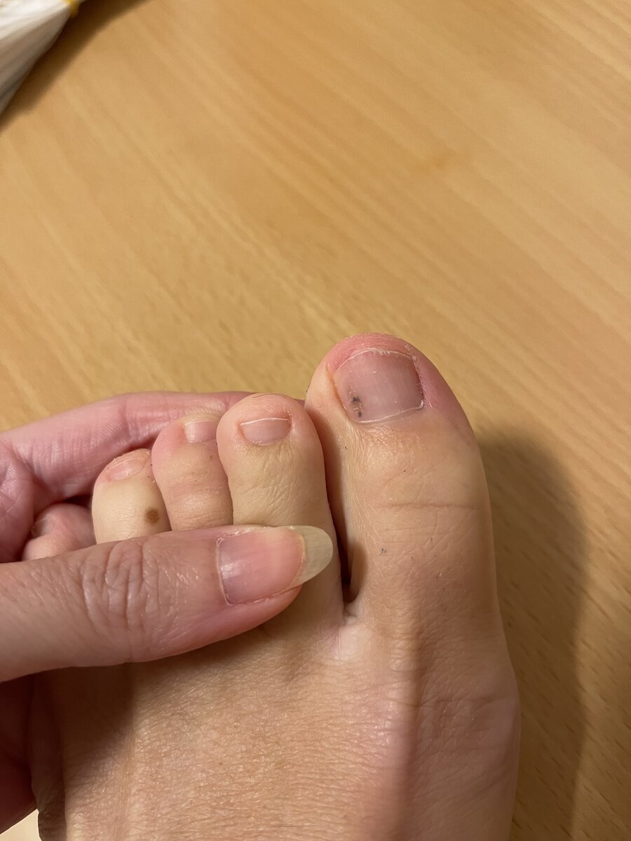 ho 35 anni e da qualche giorno ho scoperto di avere queste piccole macchie nere in entrambi gli alluci dei piedi.