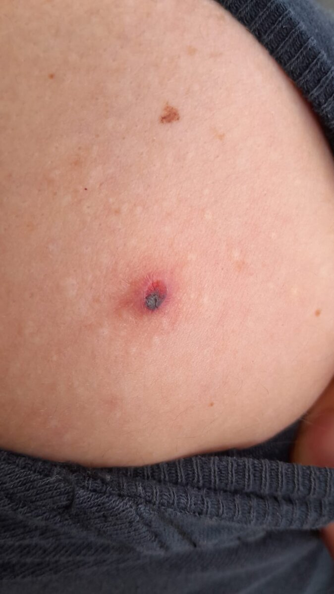 Buonasera scrivo in quanto da piu’ di una settimana è comparso uno strano brufolo molto gonfio e doloroso nulla spalla destra. Sfiorandolo e provando a schiacciarlo e’ uscito sempre e solo sangue (mai pus) e nei corso dei giorni e’ migliorato sgonfiandosi (dopo essere stato bucato da un ago). Il problema e’ che si e’ trasformato in una macchina nera traslucida come se in concomitanza del brufolo ci fosse presente (al di sotto o al di sopra) un neo. Dall’ultima visita dermatologica di Marzo 2024 non erano apparsi nei preoccupanti o da tenere sotto controllo. Ho gia’ fissato una nuova visita dermatologica di controllo ma volevo anche un vostro parere in quanto sono molto preoccupato. Grazie mille