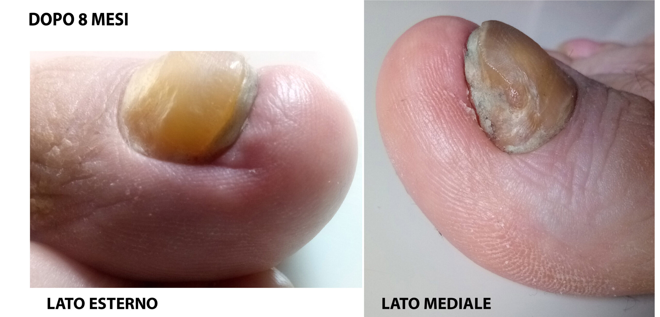 Buongiorno allego le foto dell’unghia dopo 8 mesi dal taglio. L’ho fatta vedere dal dermatologo che mi ha detto di mettere xerial 40 e provare a limare in altezza. Per tagliare invece aspettare che sia più lunga.