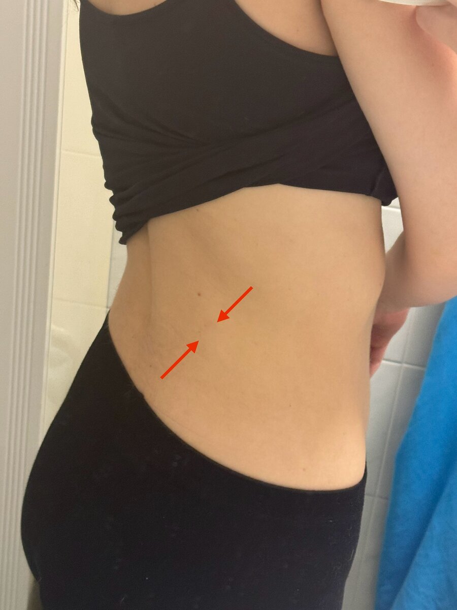 Inizialmente ho pensato ad un nodulo muscolare essendo che al tatto mi sembra abbastanza duro e adeso, e giorno dopo sono andata a fare un ecografia per essere sicura, e il referto dice: “ al fianco sinistro si rileva erniazione di tessuto adiposo interfasciale estesa per 8, 8×2,8×3,4mm, con diagnosi di lipoma fasciale toraco lombare sx.”