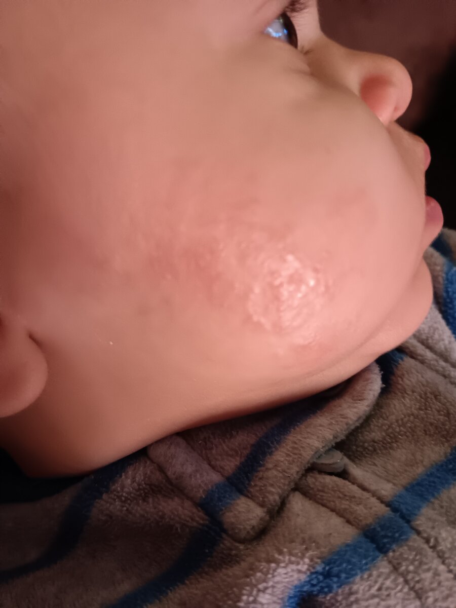 Penso sia Dermatite irritativa alla guancia ed punture d’insetto il resto. La guancia non va bagnatao lavata ed occorre ascuigare bene se si sporca con cibo latte ecc. La sera applica una punta di MOST Crema  Lentitiva.