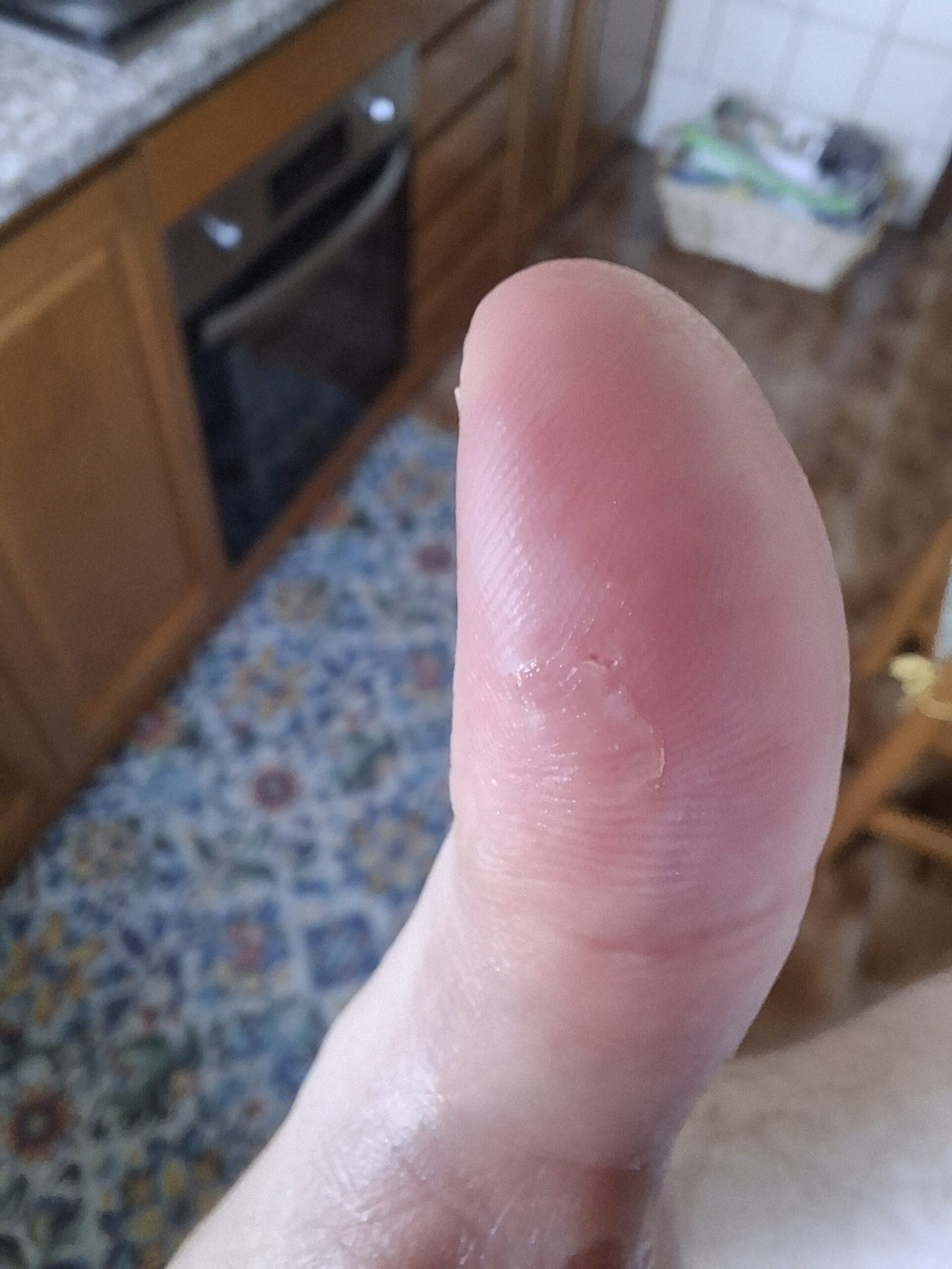 Quella alla base del pollice è abbastanza fastidiosa per la zona e perché brucia, mentre a quella al polpastrello se ne sta venendo via la pellicina, ma non l’ho tolta e l’ho lasciata là.