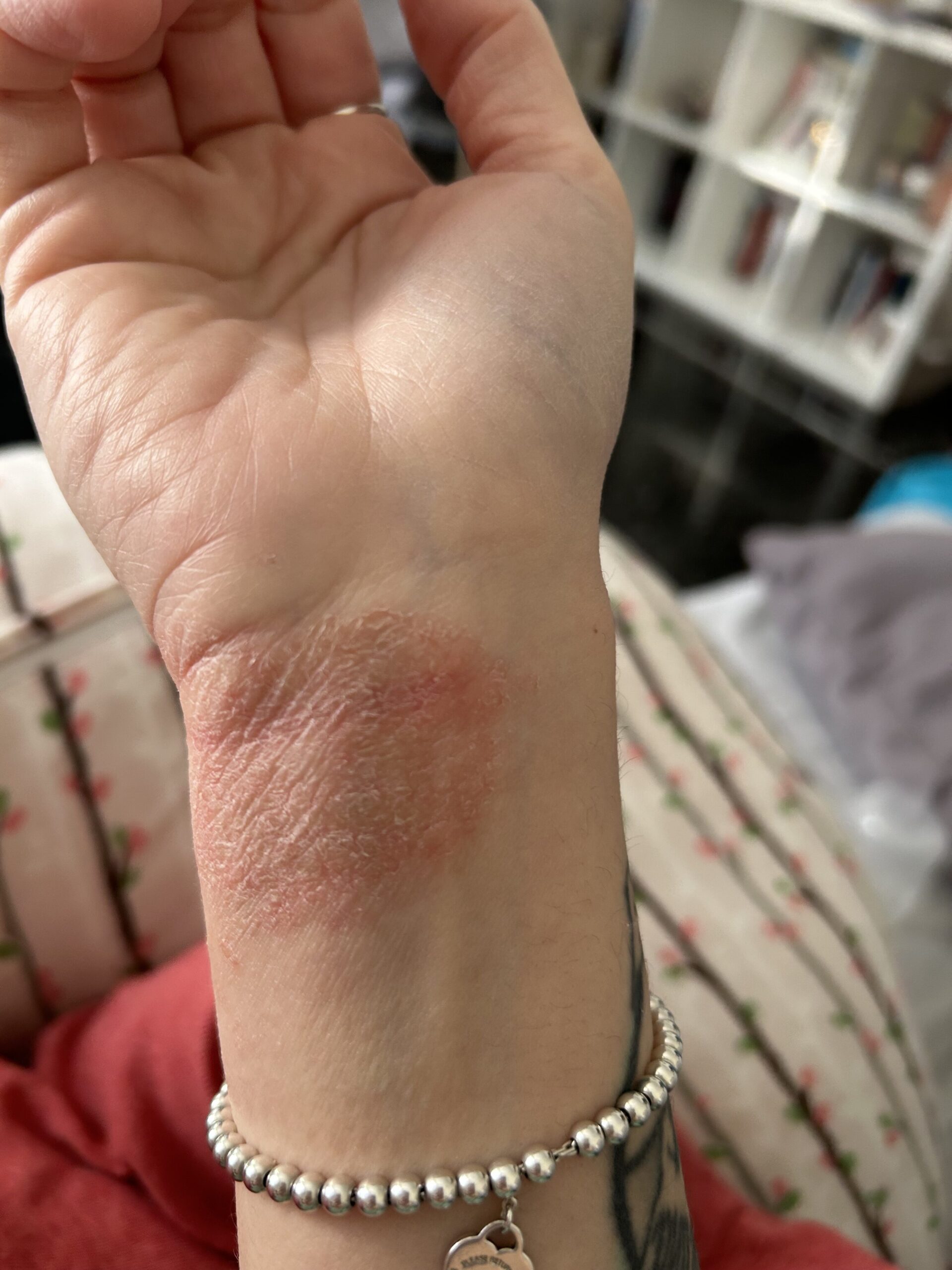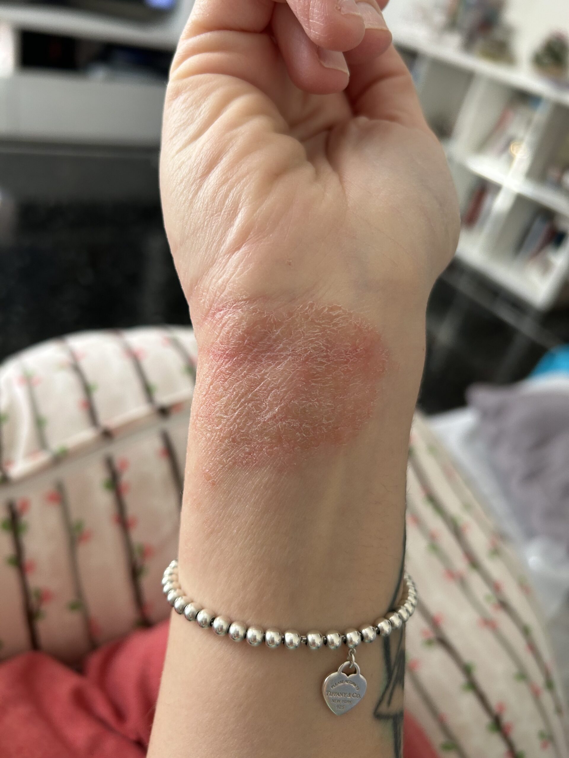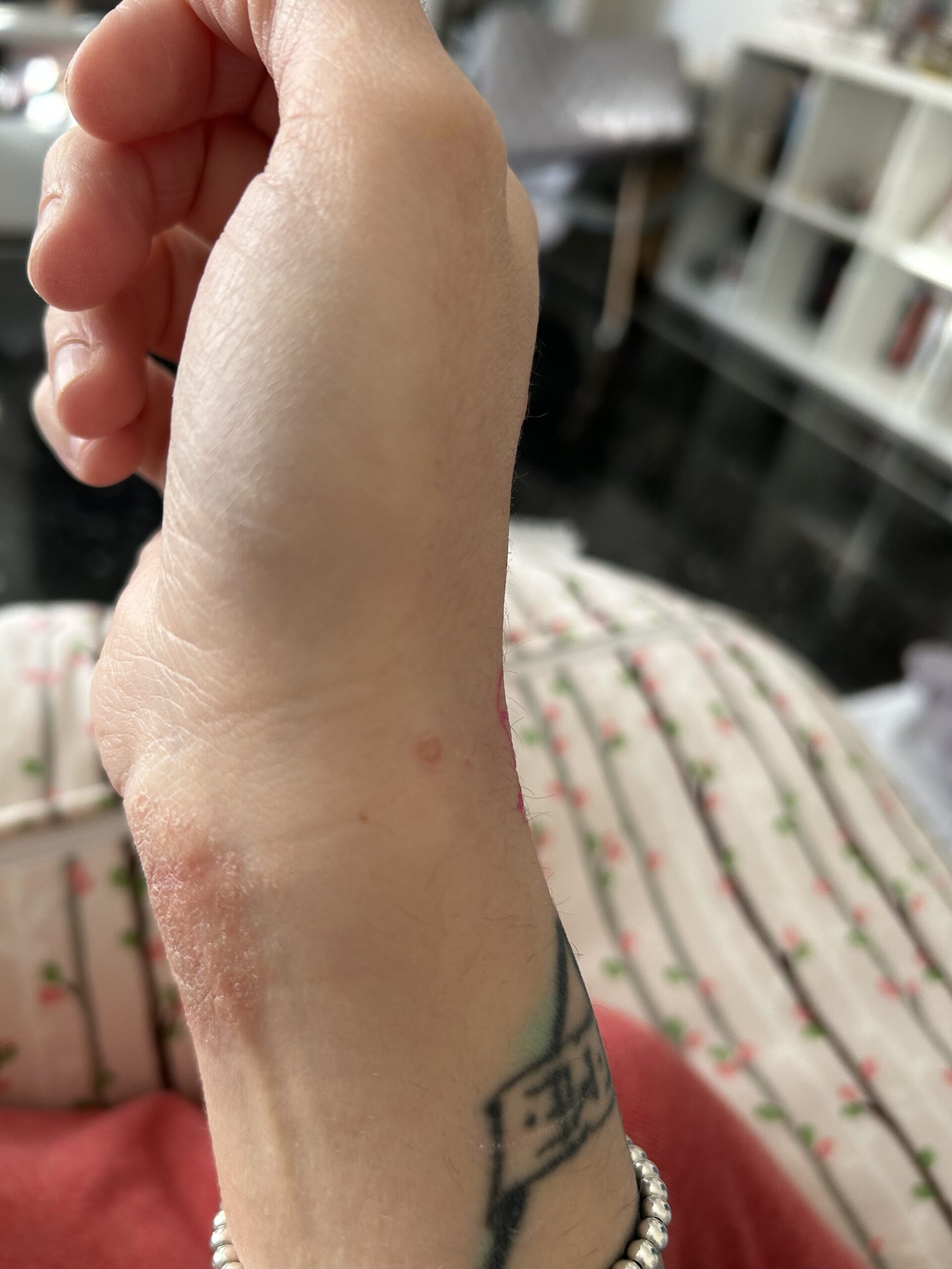 E’ una dermatite da contatto e se non eviti del tutto di bagnare non guarirà, usa guanti di Nitrile ed accertati che l’acqua non finisca sulla chiazza. La sera puoi applicare una punta di MOST PEG Unguento.