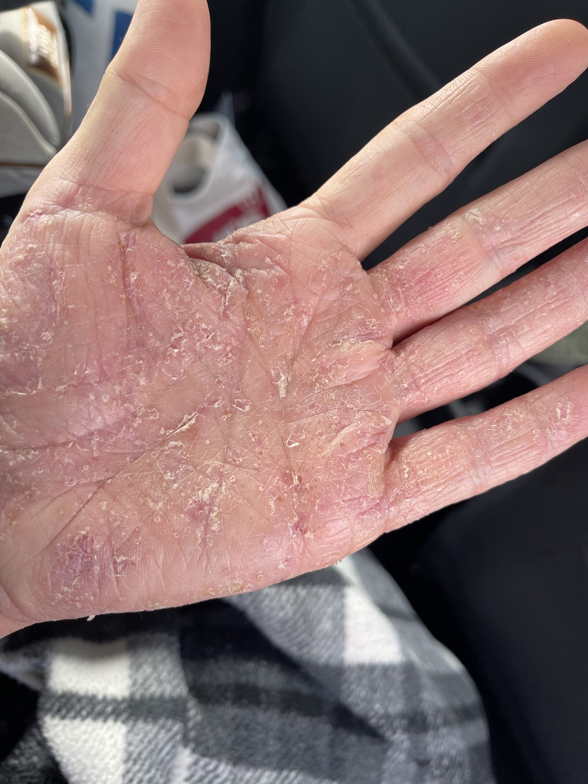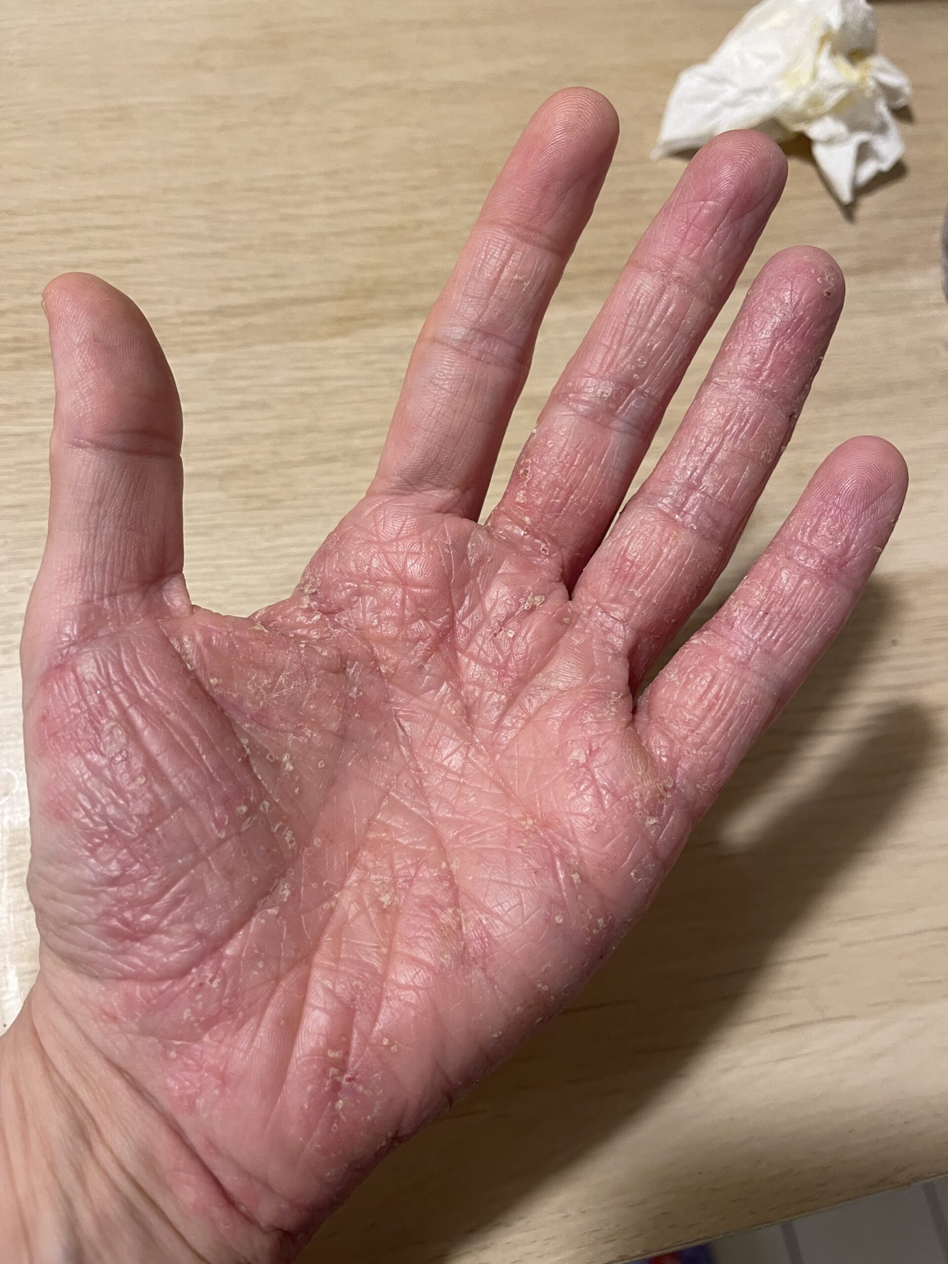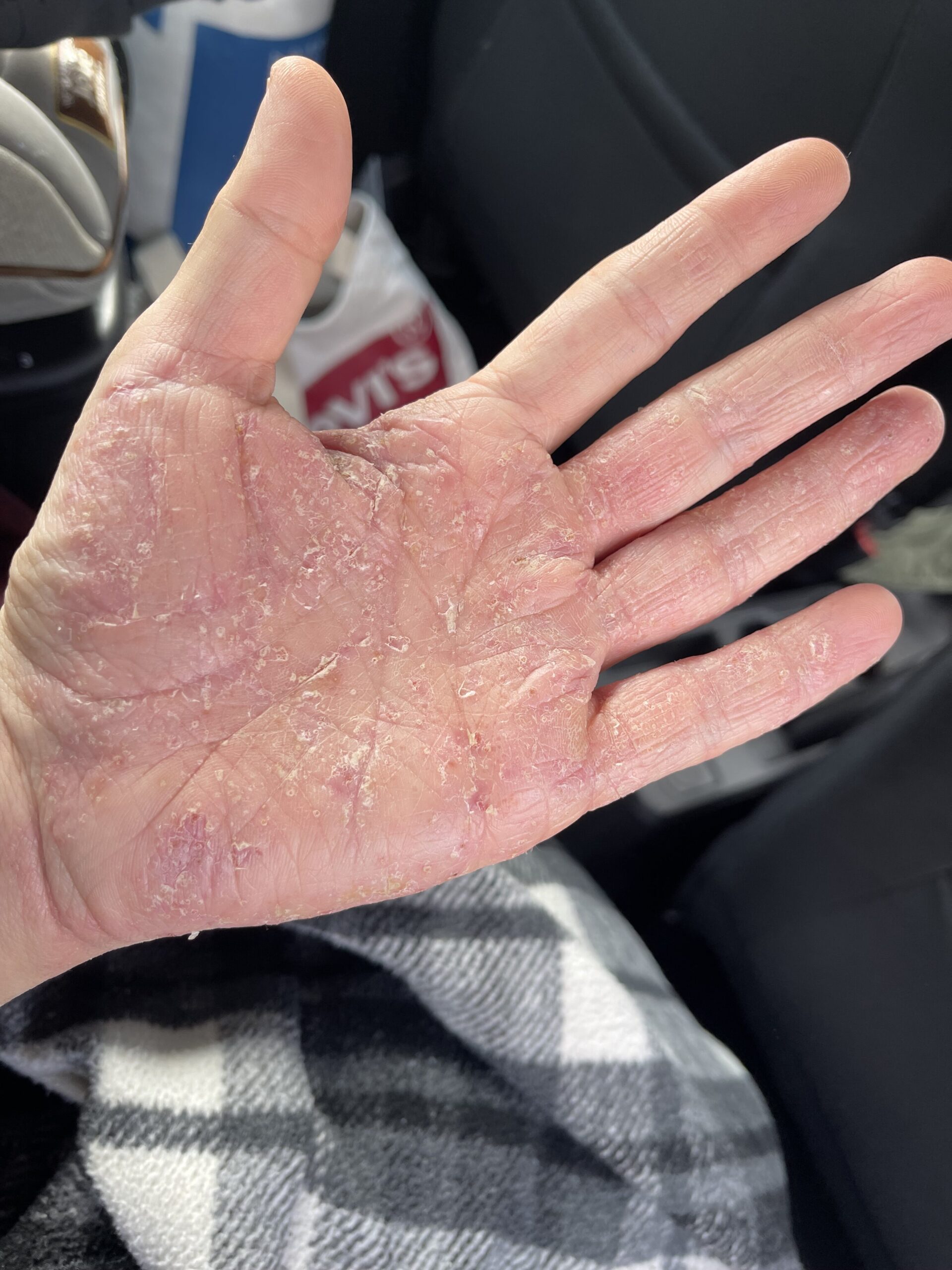 Cerco di stare lontana da acqua e mettere guanti di cotone sotto i guanti per fare doccia e lavare le stoviglie ma purtroppo con un neonato non è facile.