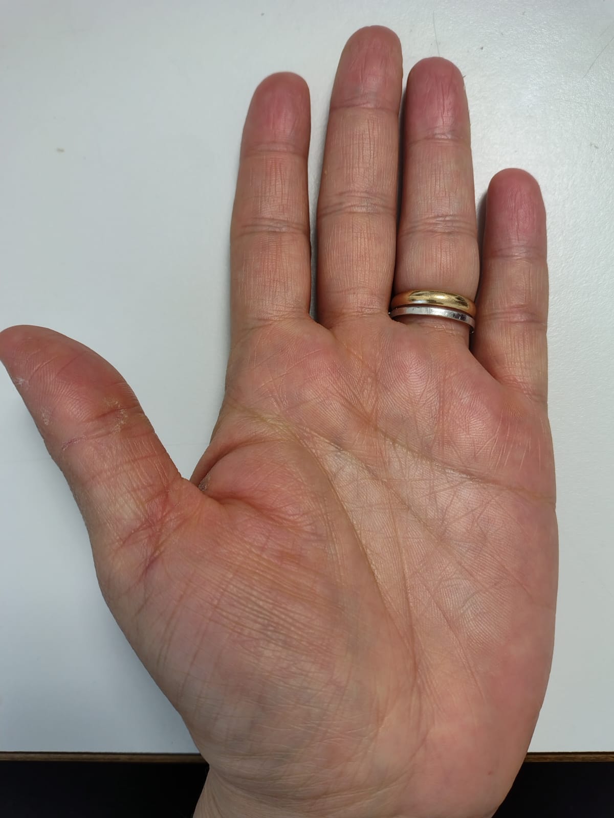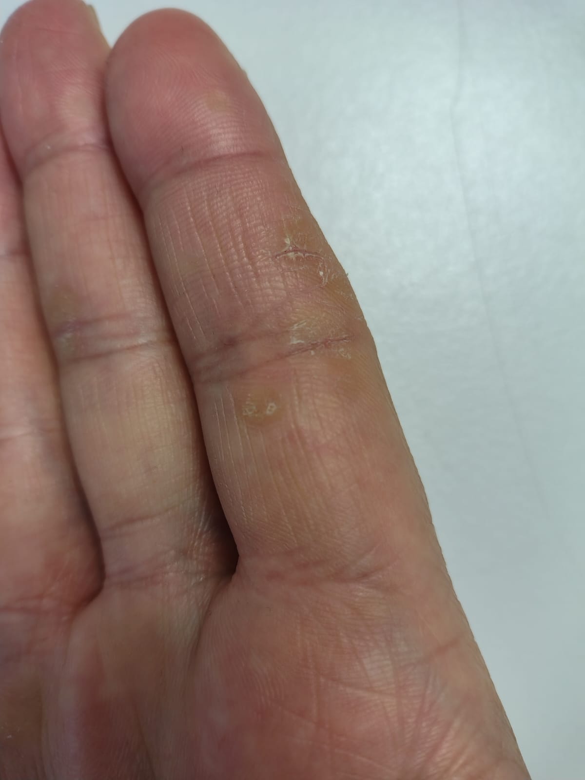 Probabile Disidrosi lieve, non bagnare mai le mani , usa guanti di Nitrile e la sera applica una punta di MOST Crema 2 S