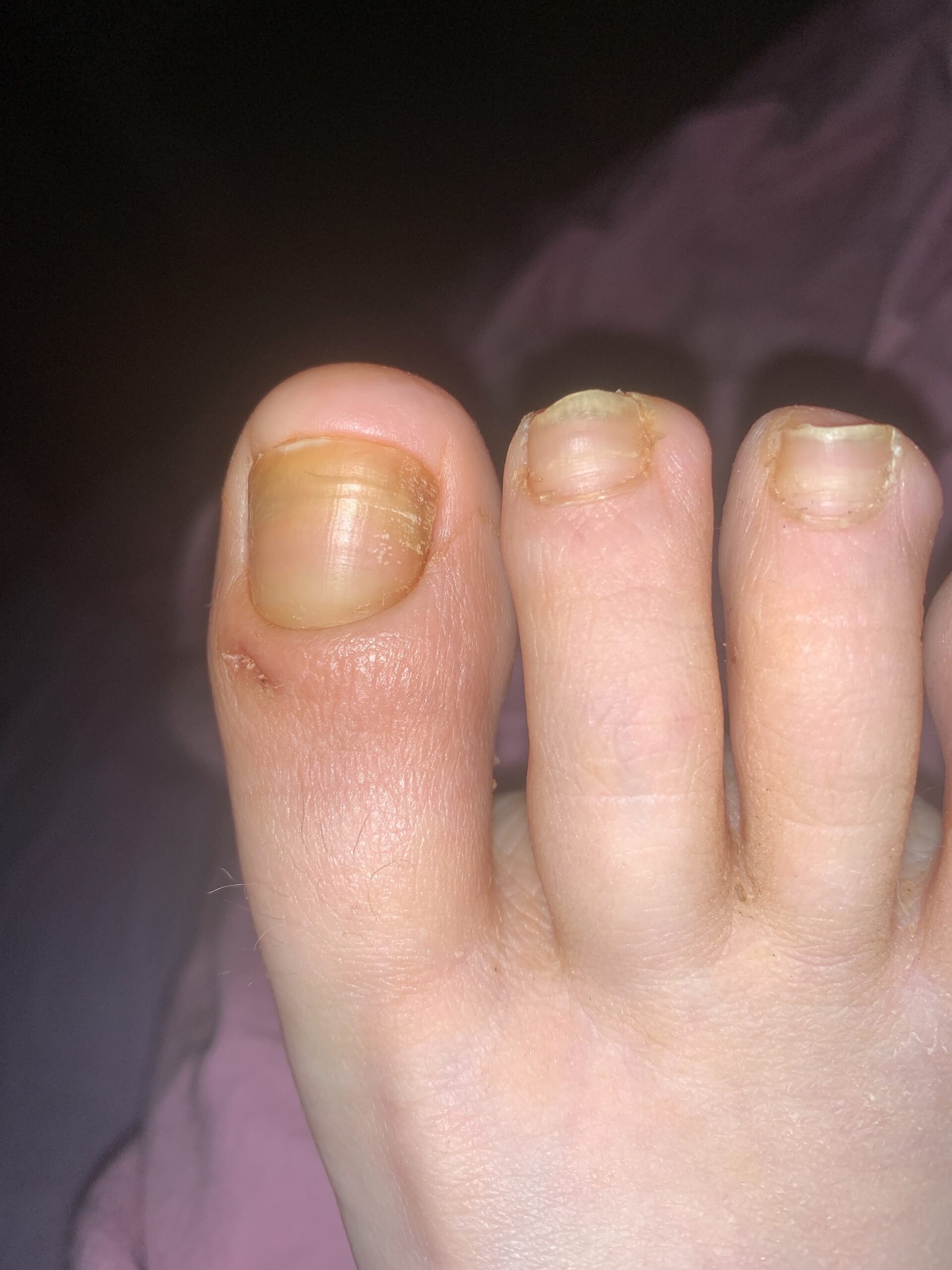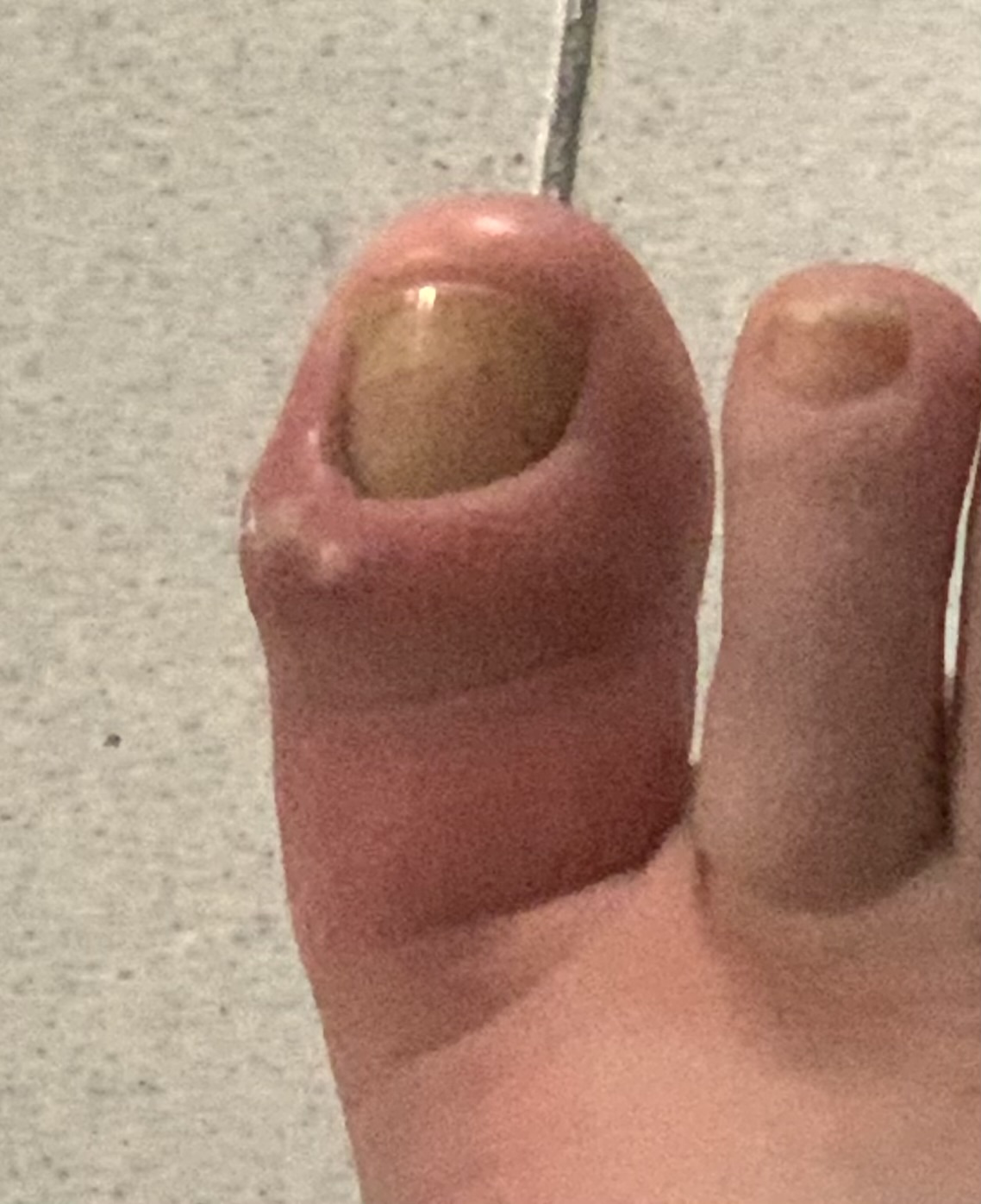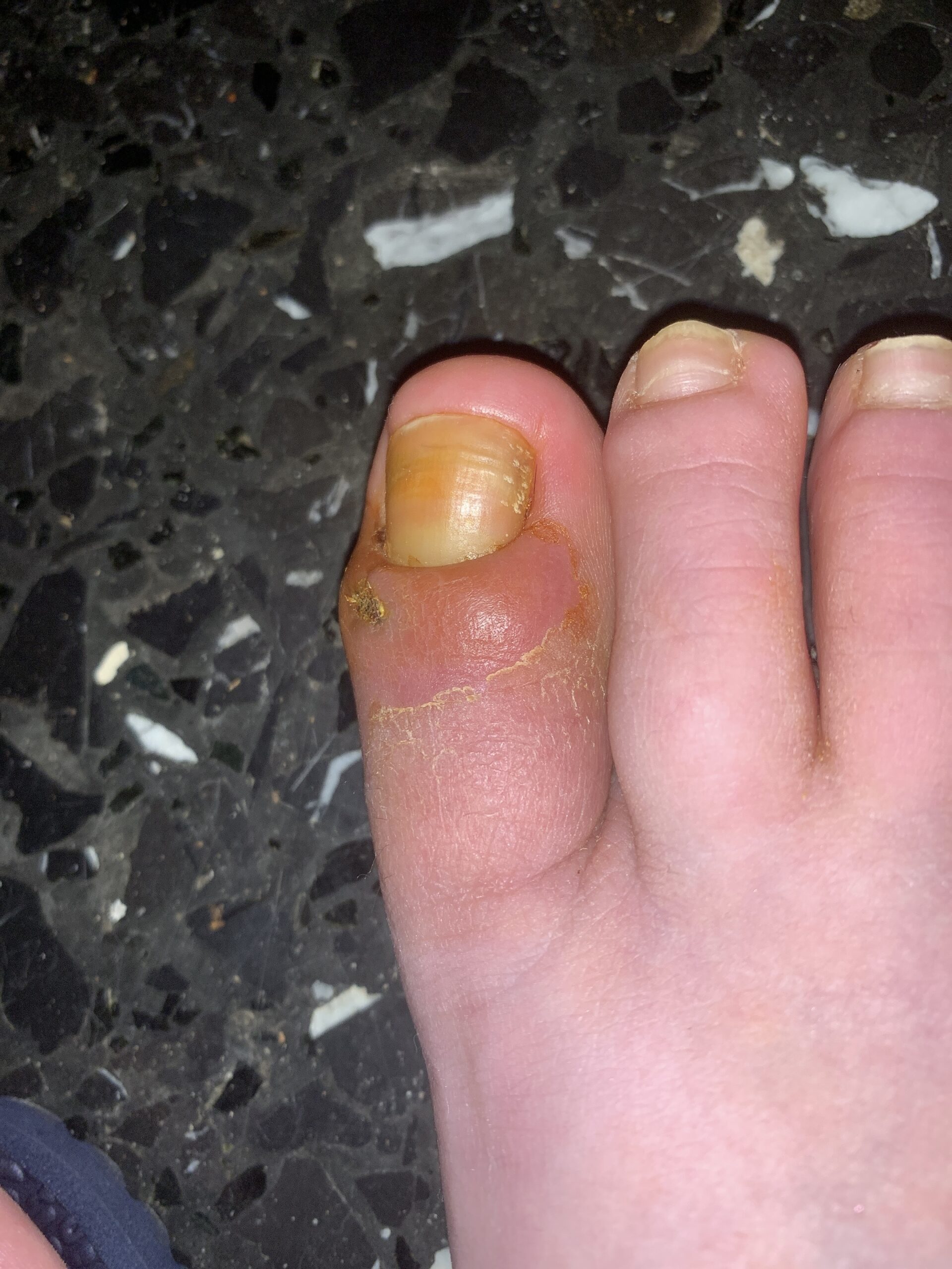 arcanaDmPartecipanteHo avuto una grave infezione da giradito all’alluce destro causata da doppi calzini indossati in inverno , “curata “con un mese di antibiotico e rimozione del pus. Al mattino l’alluce appare come in foto e, appena lo metto giù, diventa rosso e infiammato. Non lo bagno più, lo espongo 30 min al giorno al sole.