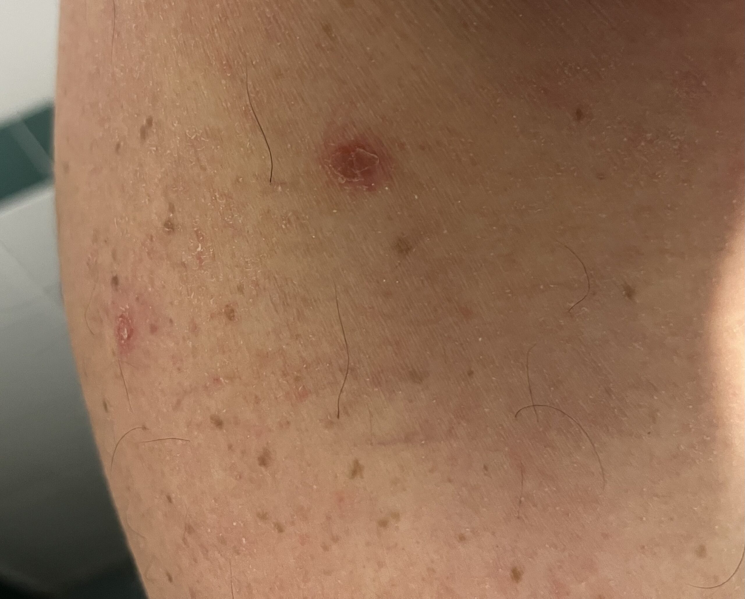 da 5 giorni ho una macchia rossa che desquama, se tolgo la pellicina il fondo torna ad essere rosso vivo e brucia leggermente a toccarlo. Da ieri mi è comparsa la seconda (quella “laterale”).