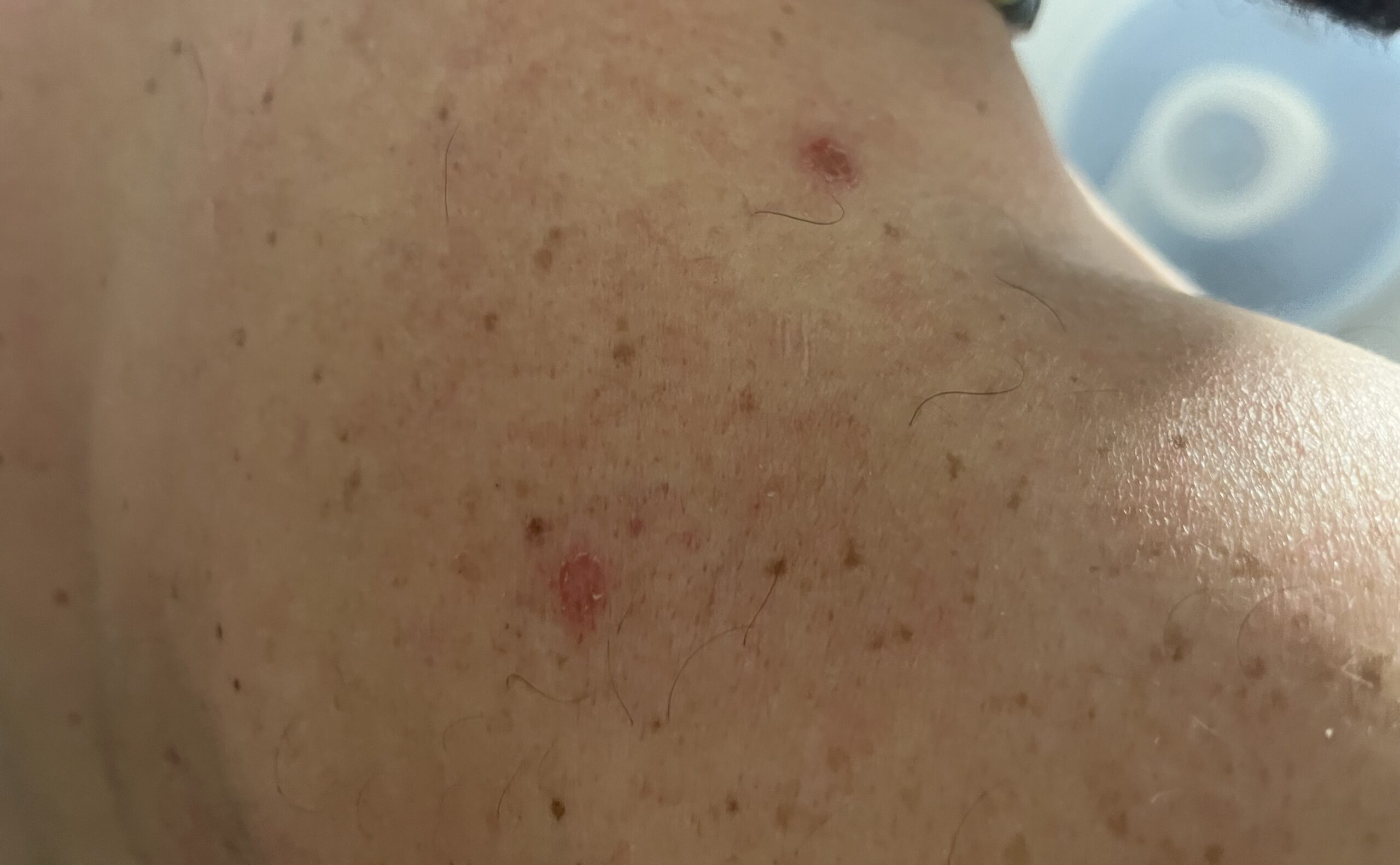 Le allego la loro evoluzione (ammettendo di averle spellate non proprio delicatamente prima delle foto di qualche giorno fa). Una appare come una semplice macchia cutanea senza crosticina, l’altra sembra stia guarendo.