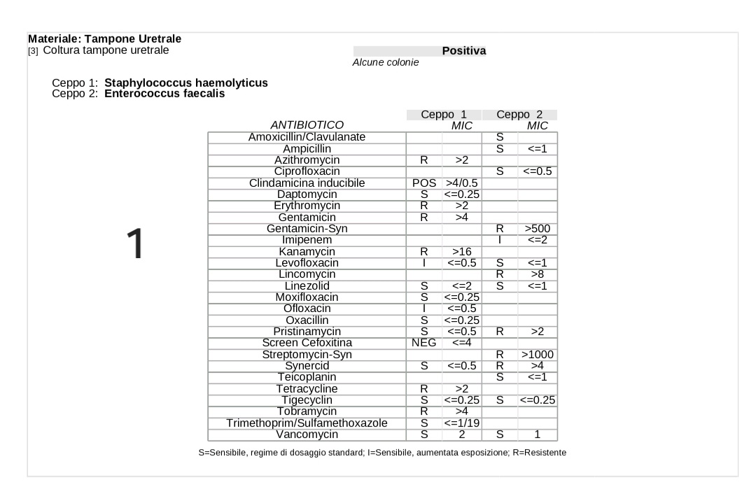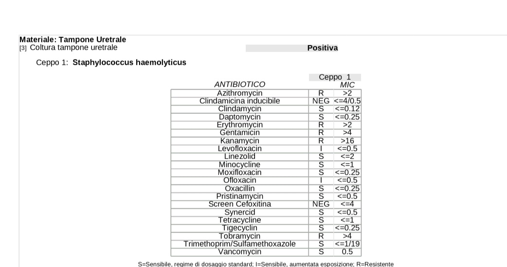 Per il pene mi hanno fatto usare. Travocort……fisian detergente…fucidin crema….meclon crema…e pevaryl crema…..lamisil crema….boracid detergente. ..clindamicina crema…. il tutto non fa nulla sono sempre cosi….per gli occhi un collirio a base cortisonica anche qui dopo 10 giorni ritorna la blefarite……..per i piedi niente ho fatto bagni caldi con acqua e sale ed e sparito….ho provato un mese di most peg unguento….ma non cambia nulla…..questo e l’unico batterio che e uscito….urinocolture e chimico fisiche sempre negative….ora inserisco lantibiogramma…quello 1 e quello uretrale l’altro e quello cutaneo dove ho preso il pus…..grazie…..