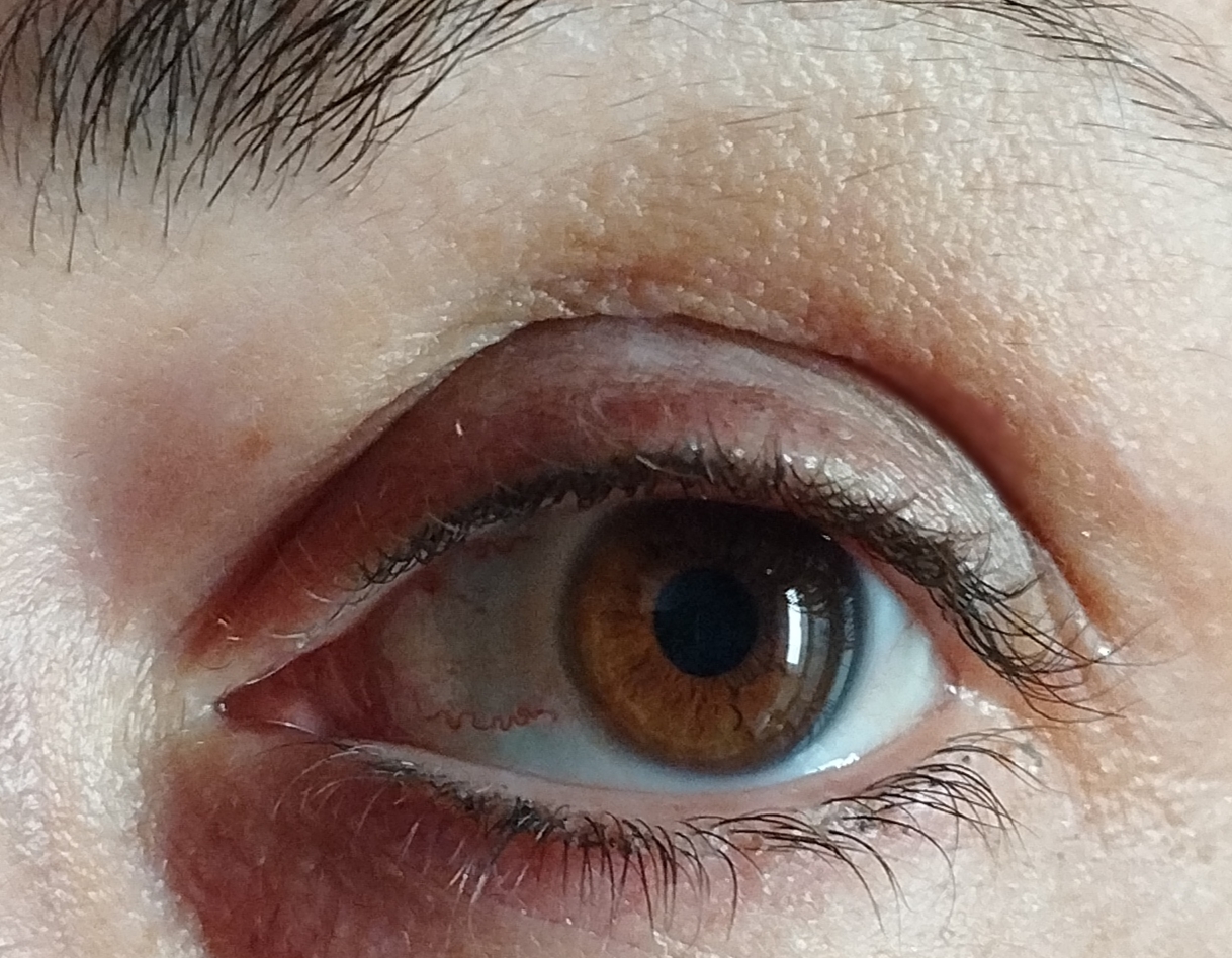 Sospendi sia il trucco occhi sia il bagnare le palpebre , non colliri , l’occhio non ha nulla.