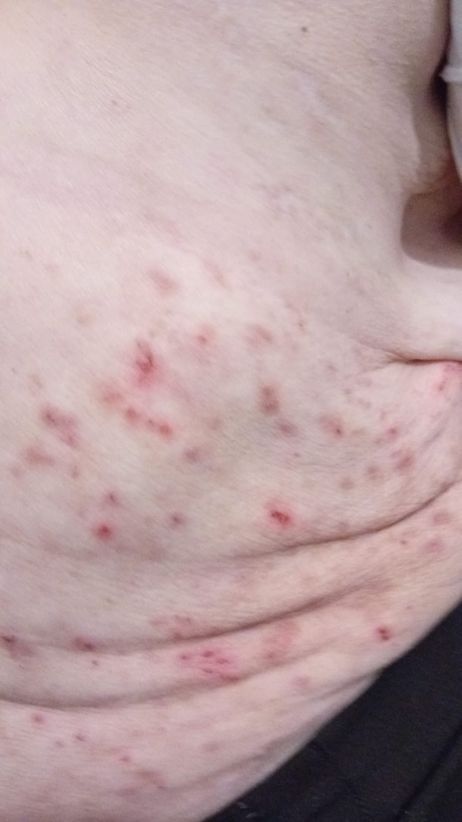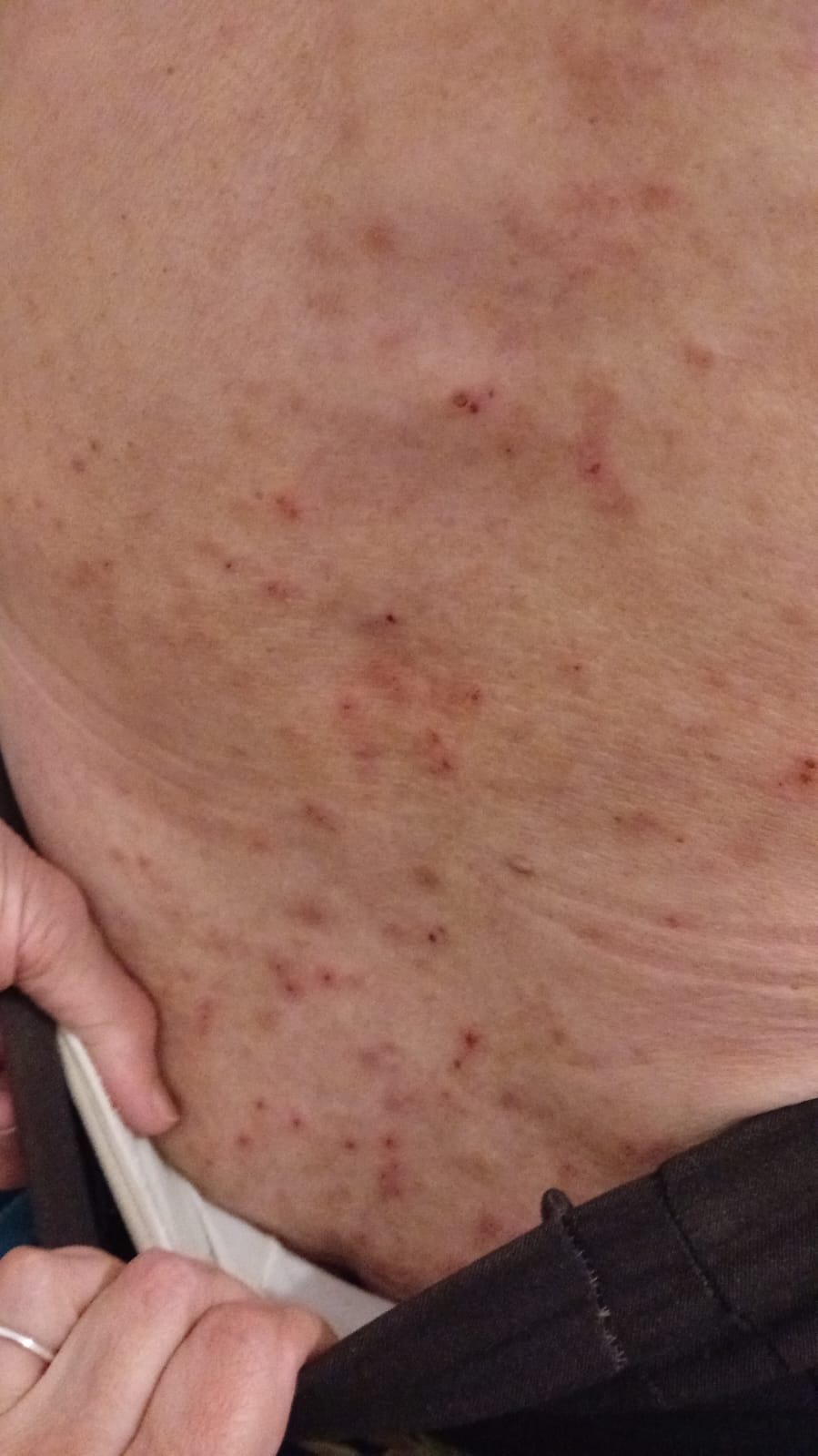 Può trattarsi di Prurigo Senile senza causa specifica, quando hai le lesioni devi sospndere di lavare il corpo con l’acqua mentre puoi pulirti a secco con la soluzione di Permanganato di potassio come spiegato in dermaclub.it e poi applicare una punta di MOST Crema Lenitiva.