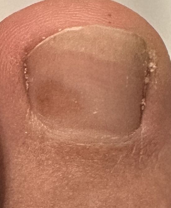 Ad oggi l’unghia è così, dopo aver piano piano tagliato la parte macchiata mentre l’unghia cresceva.