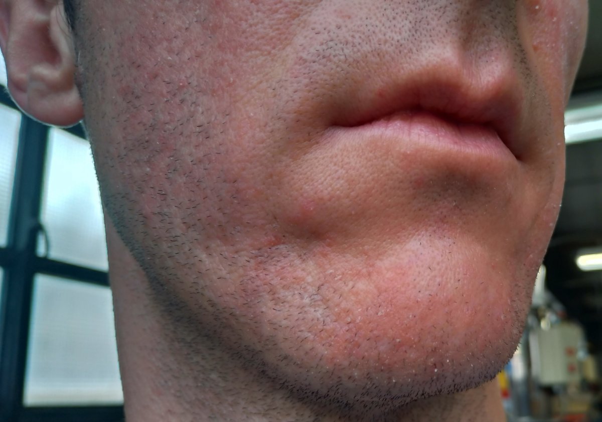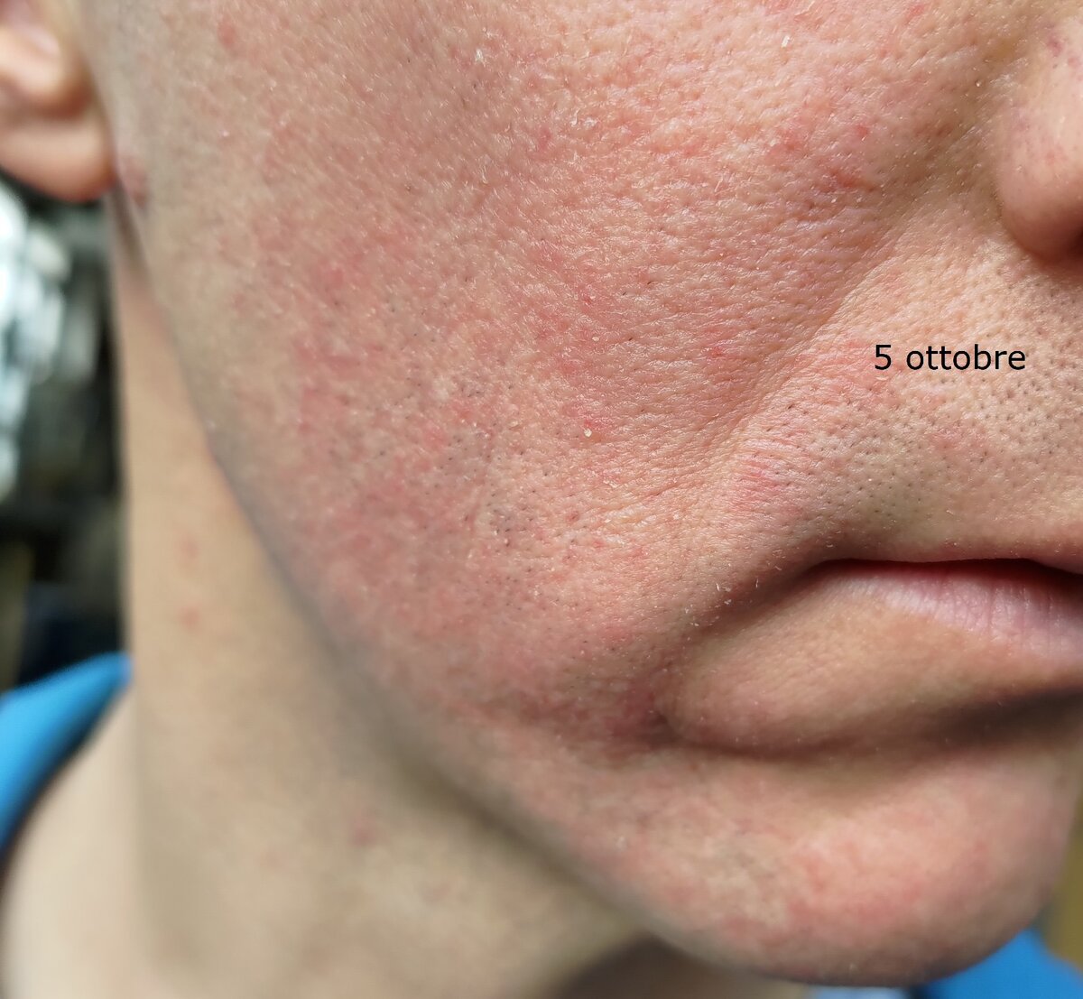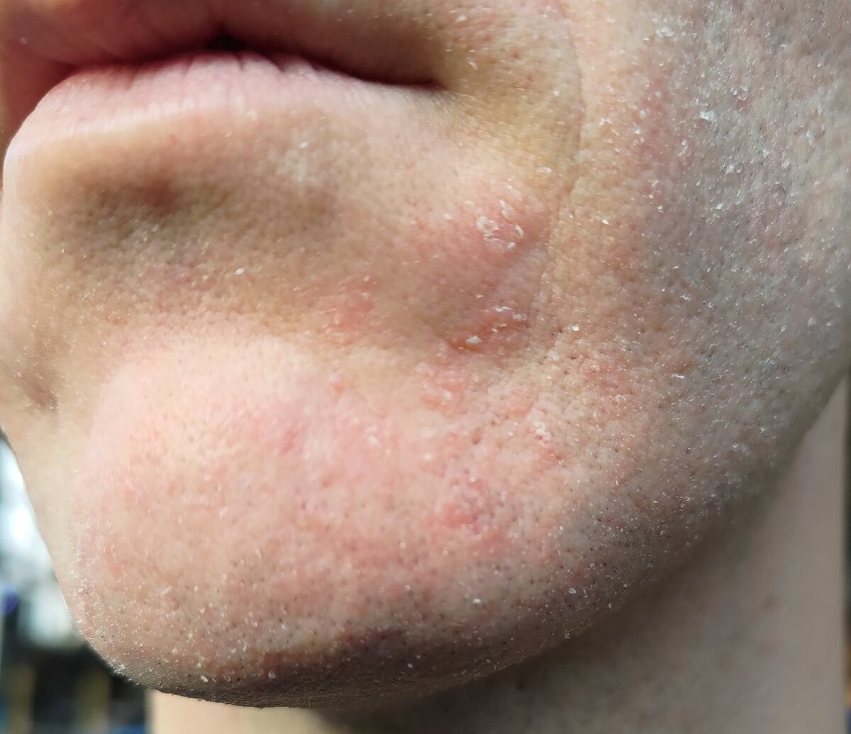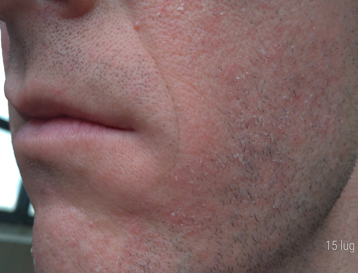 purtroppo dopo un paio di giorni di regressione, inspiegabilmente la situazione è precipitata, forse peggio di prima. Da lunedì è apparsa questa forte irritazione che non accenna a diminuire, anche la zona del mento che non è mai stata particolarmente coinvolta dal fenomeno.