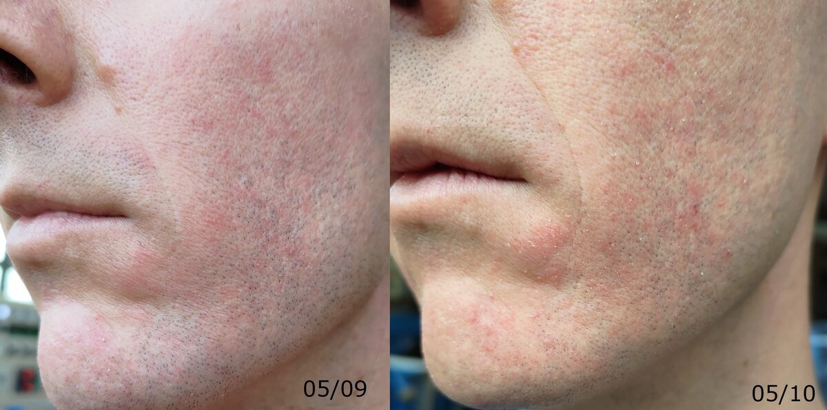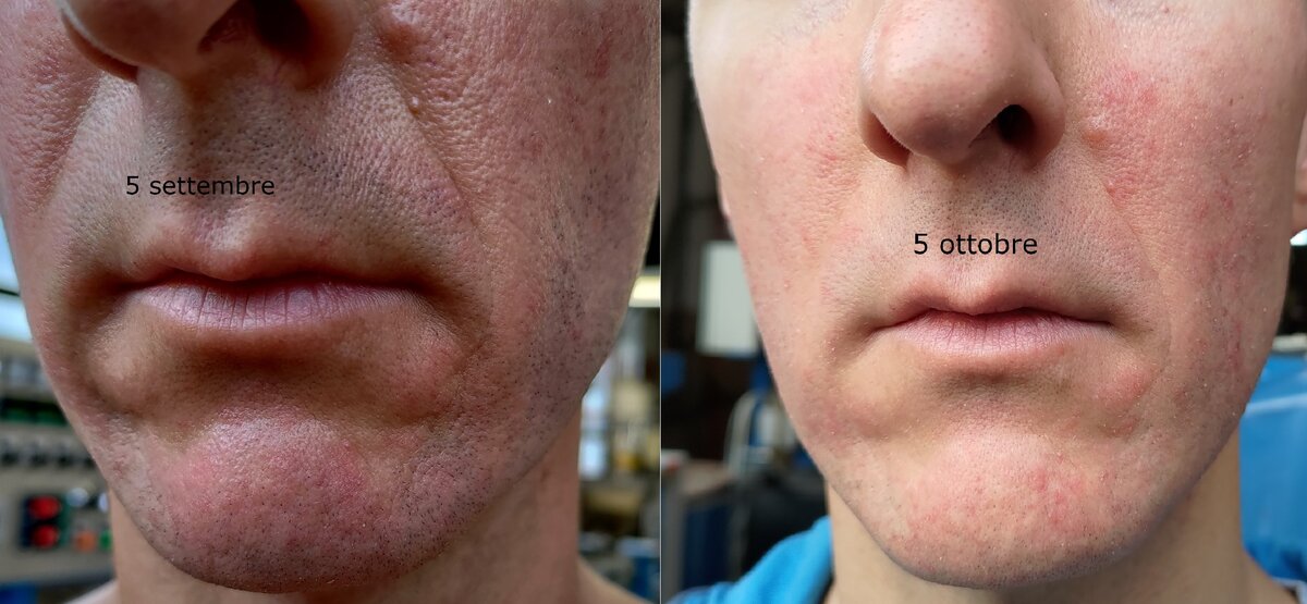 Dopo quasi un mese di applicazione corretta e costante, lavaggi solo con acqua tiepida da ormai anni, la situazione è quella della foto (un mese fa e oggi).Storicamente è presente una eritrosi che pare negli ultimi anni essersi estesa al mento e nell’ultimo mese con la crema 2S la cute si secca e desquama quotidianamente ma sono un po’ scoraggiato perchè la pelle nuova sembra già arrossata e fatica a presentarsi stabile e non irritata.