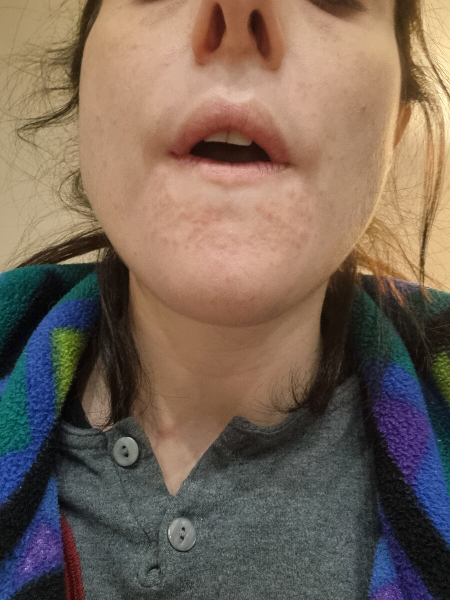Detto questo e tornando alla mia pelle, le allego anche ulteriore foto che ieri non ho potuto inviarle per mancanza di spazio. È uno sfogo sotto le labbra che mi prude molto ed è uscito in concomitanza degli altri di cui le ho mandato foto.